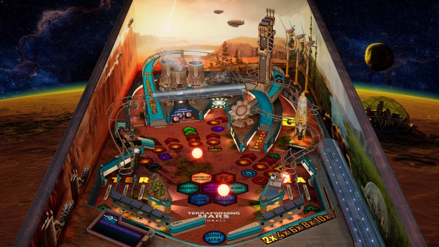 本包中的最后一张桌子是针对 Terraforming Mars 的,这是由 Jacob Fryxelius 创建的桌游的弹球版本,让您在其他公司有机会分一杯羹之前进行一场将火星地球化的竞赛。此旅程的第一步是选择您将代表哪家公司。一旦解决了这个问题,你将获得被动的能力——比如更高的主模式分数——或者你必须使用启动按钮激活,这样你就可以在某些模式下冻结计时器,或者进行即时保球。