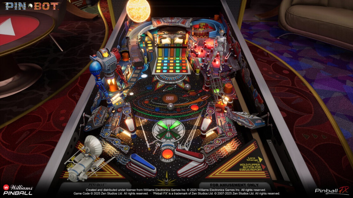 该组中的最后一个表是 PIN-BOT。该桌子于 1986 年发布,是弹球桌三部曲中的第一款。当您解锁 PIN·BOT 的面罩并尝试赢得头奖时,您将踏上穿越太阳系的旅程。一旦遮阳板打开,您可以将球锁定在两个眼窝中,开始2球多球,在此过程中所有分数都会翻倍,从而为您提供提高总分数的好机会。将一个球放入其中一个眼窝,您将激活定时日食,在此期间您可以收集大量的太阳能价值分数奖励!