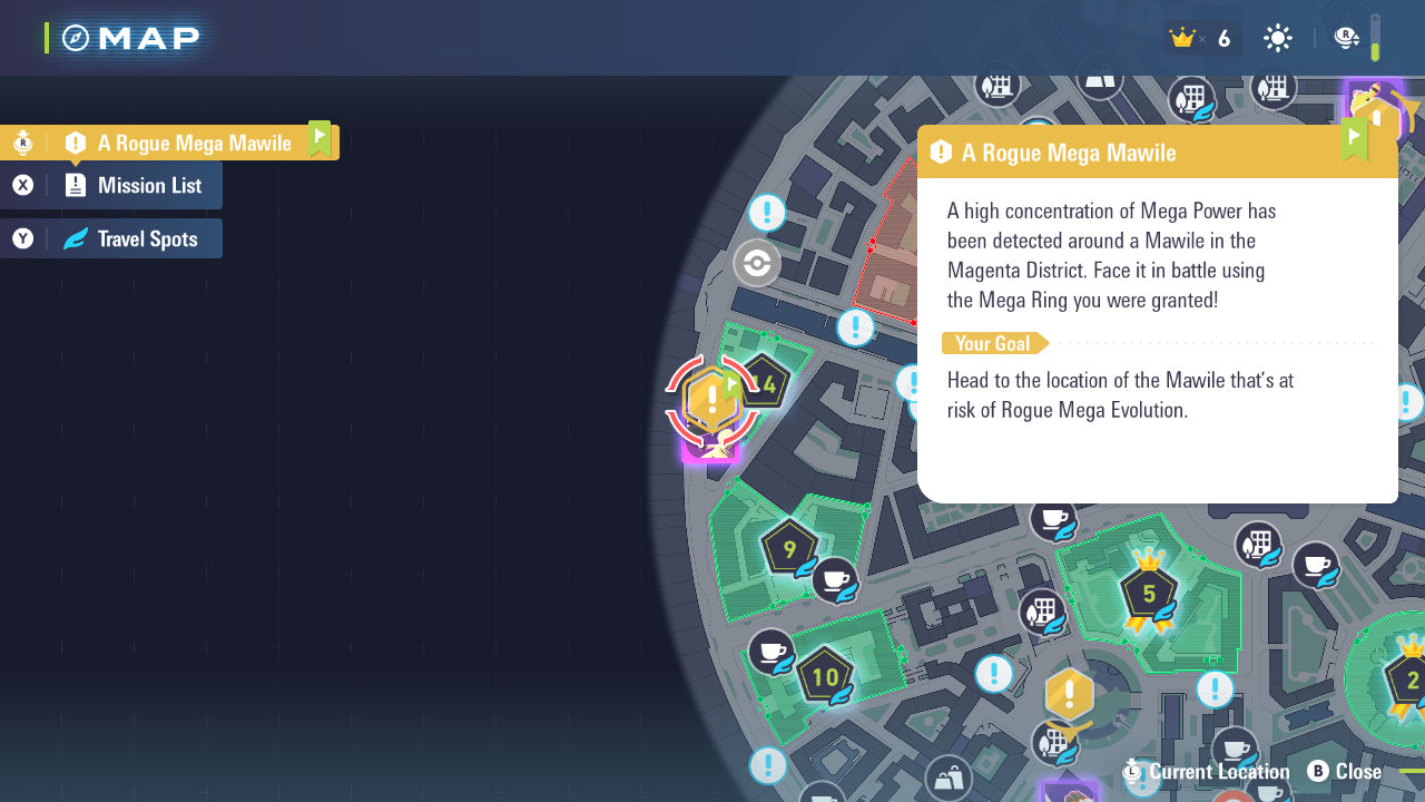 在Z酒店与Lida会面后,你被分配寻找Rogue Mega Mawile的任务。Lida会要求你调查Rogue Mega Mawile洋红色区第 6 区,所以这就是您需要去的地方。从 Hotel Z 出口出来,快速前往 Magenta 区的 Cafe Gallant。产卵后,向西走,拿走你看到的第一个 Holovator。然后,您需要跑酷穿过屋顶才能到达目的地。
