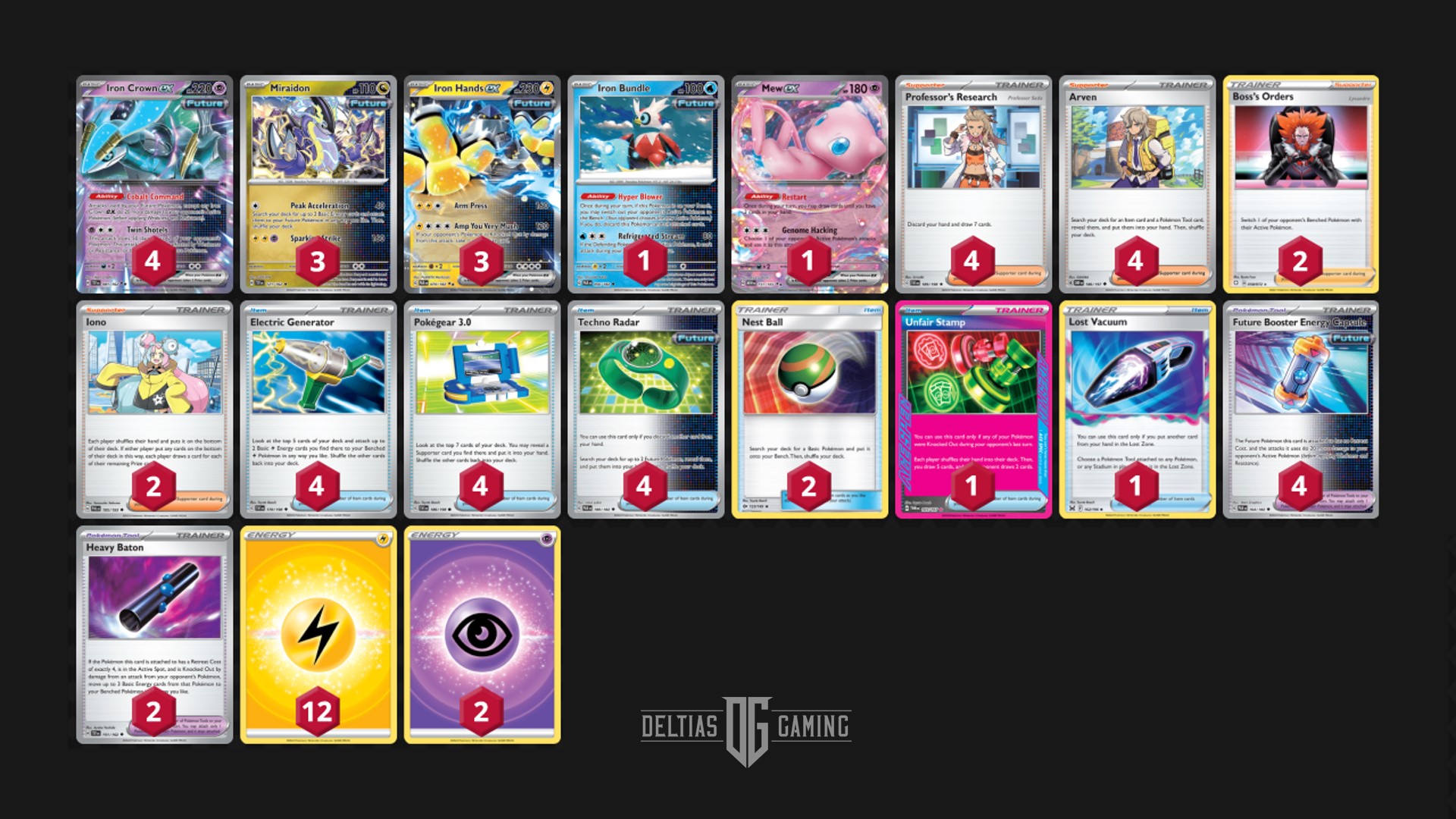 这套牌想要在第一回合占据第二位,使用支持者卡牌并用 Miraidon 进行攻击。在当前的元数据中,排名第二是完美的,因为许多卡牌都使用第 2 阶段的神奇宝贝,并且需要稀有糖果才能进入此阶段。此外,当对方队伍的活跃位置上有 60 到 70 HP 的 Pokemon 时,您可以轻松地通过早期淘汰赛获得领先。玩当前元铁手 ex 的最大技巧是通过支持和 Mew ex 管理你的绘图卡潜力。如果你把它记下来,这套牌对所有牌组都很强大,尤其是那些容易受到闪电伤害的牌组!