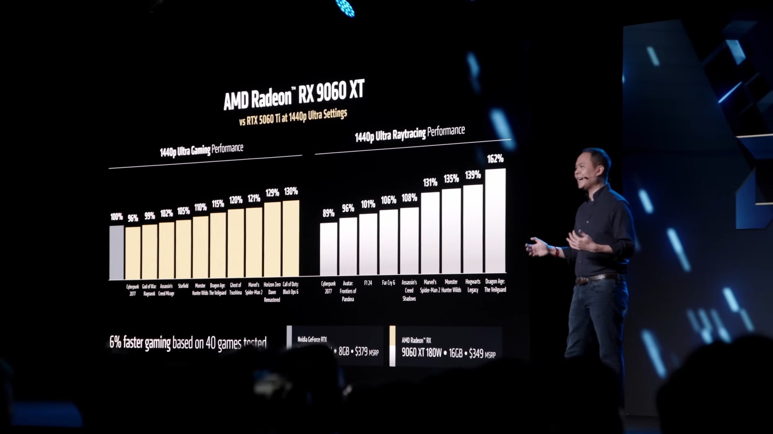 根据 AMD 提供的第一方基准测试,在 40 场游戏基准测试中,Radeon RX 9060 XT 在 1440p 下比 RTX 5060 Ti 快约 6%。该测试包括光栅化和光线追踪,Radeon GPU 在这两个类别中的平均速度更快。然而,AMD 将 Radeon RX 9060 XT 16GB 变体与 RTX 5060 Ti 8GB 变体进行了测试,这是不公平的,因为有些游戏往往会使用超过 8GB 的内存。另一方面,这似乎很公平,因为前者比后者便宜。