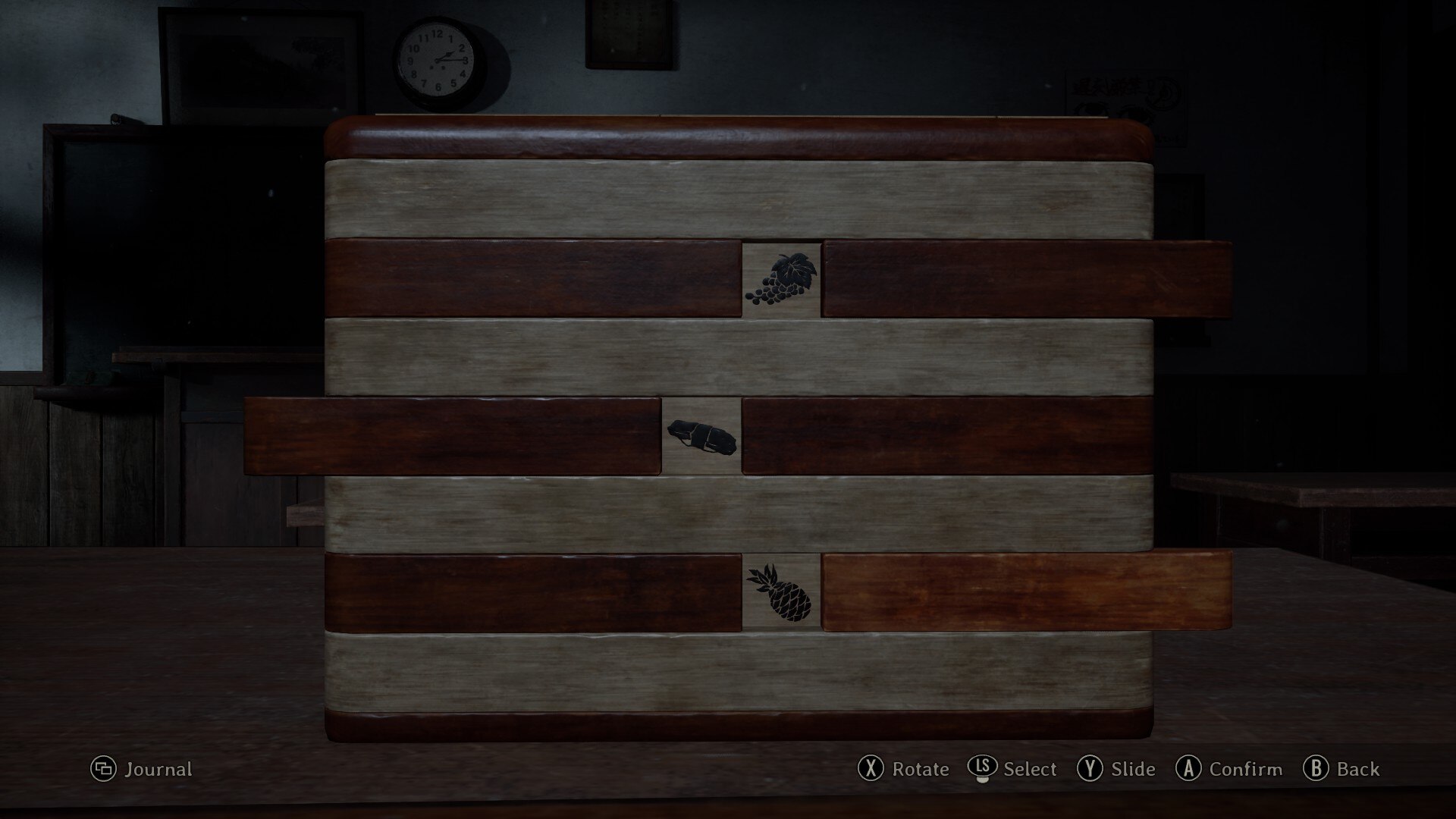 你可以在一封信旁边找到这个盒子,这封信似乎是由集。信中隐约描述了凛子对秀的喜爱和感情,以及她对日菜子的仇恨。这封信也是你解开秘密盒子的唯一线索。该拼图以日本盒子为基础,两侧各有三个锁。每个锁包含两个符号,可以通过水平拉动它们进行交互。