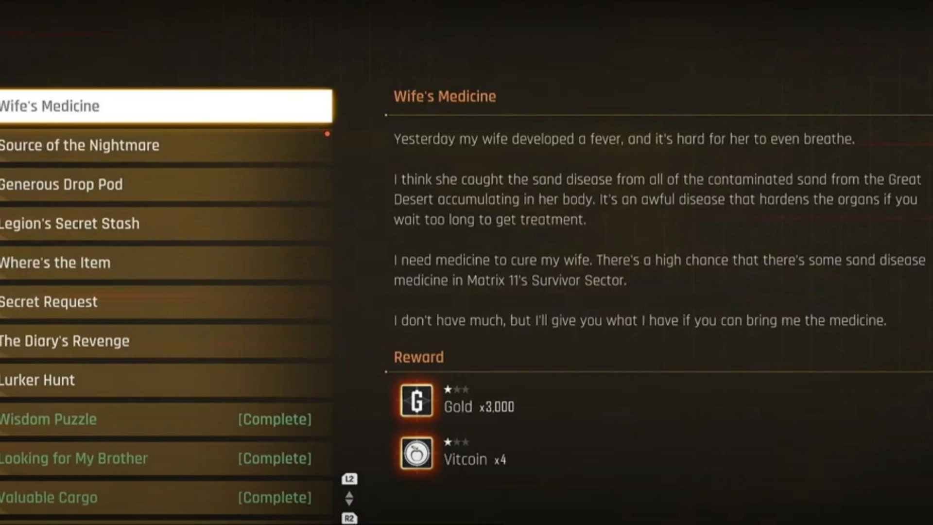 要开始任务,您首先需要深入主线剧情才能解锁 Matrix 11 区域。公告牌上出现的这个特定任务的另一个先兆是,您需要提前完成“智慧之谜”支线任务。一旦满足这两个条件,请检查 Xion 公告板并从那里接受妻子的药物任务。