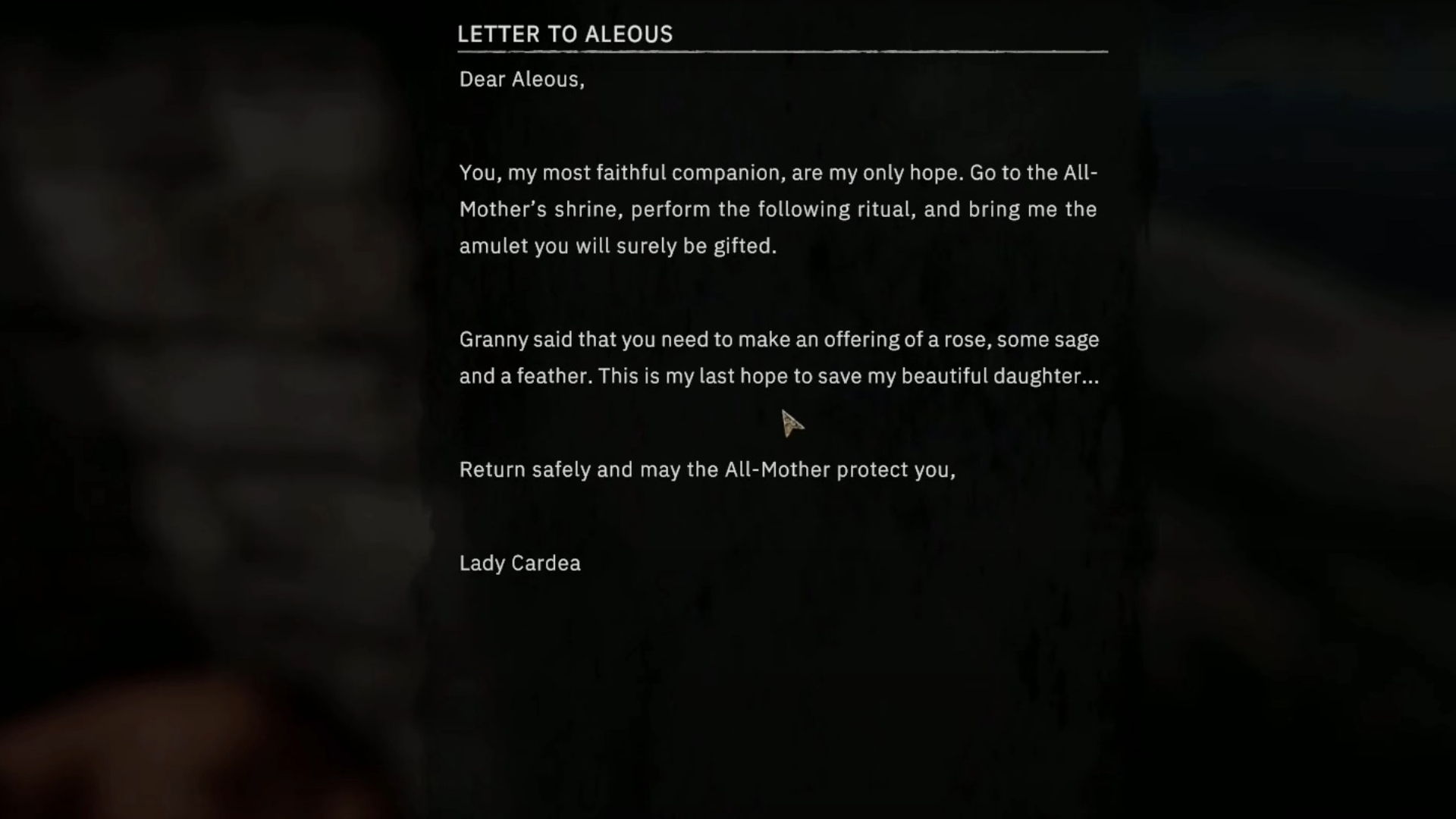 根据这封信,你会了解到你必须向万母神龛献上三件祭品,即一些鼠尾草、一朵玫瑰和一根羽毛。此时,您可能已经拥有部分或全部这些物品。不过,我们将提供一些指导,告诉您在哪里可以找到这些内容。