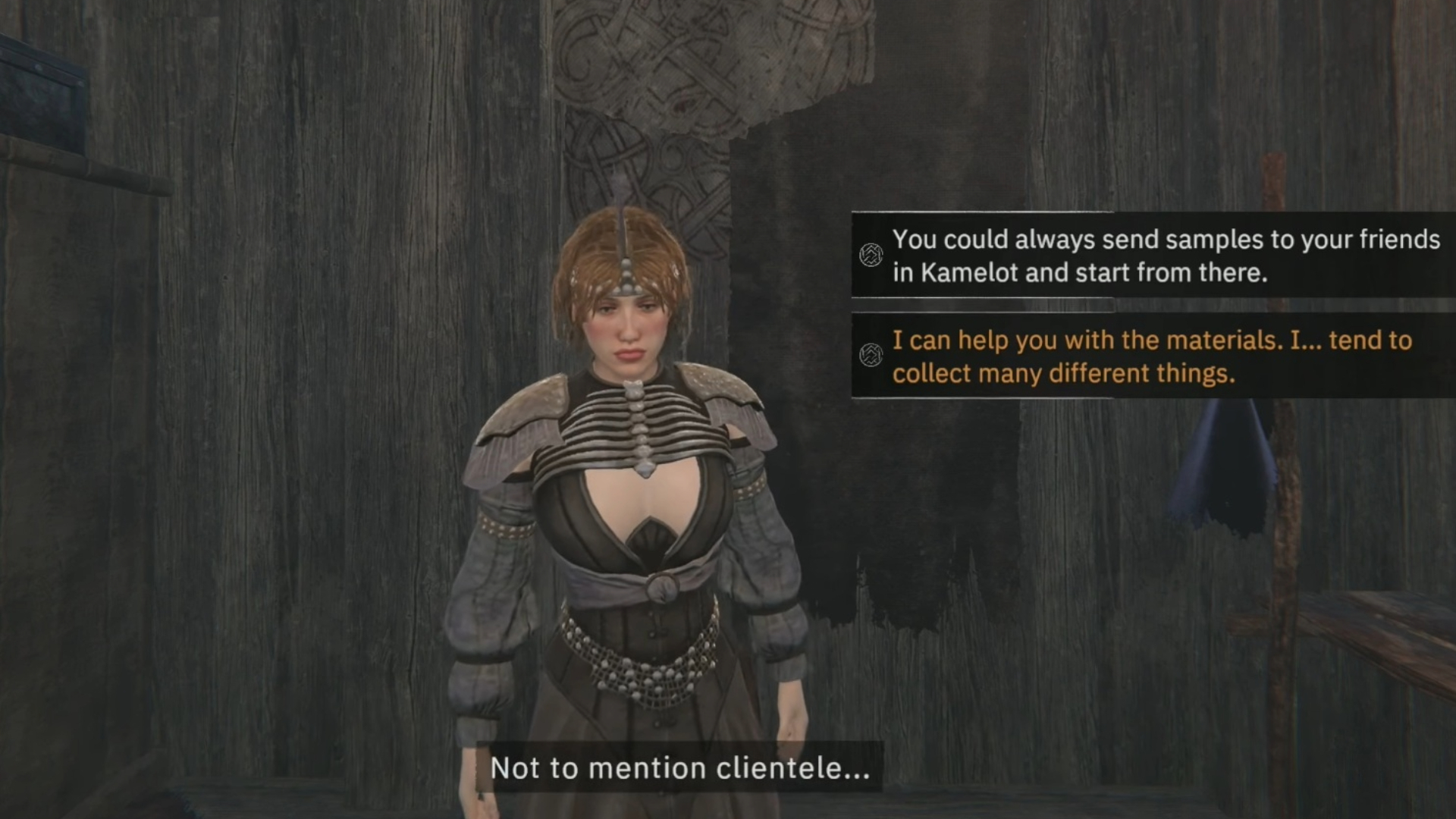丈夫“去世”后,艾丽莎想要离开。然而,你可以说服她留下来并成为一名商人。然而,当她同意时,她会要求你给她提供开始她的事业的材料。给她带以下物品。