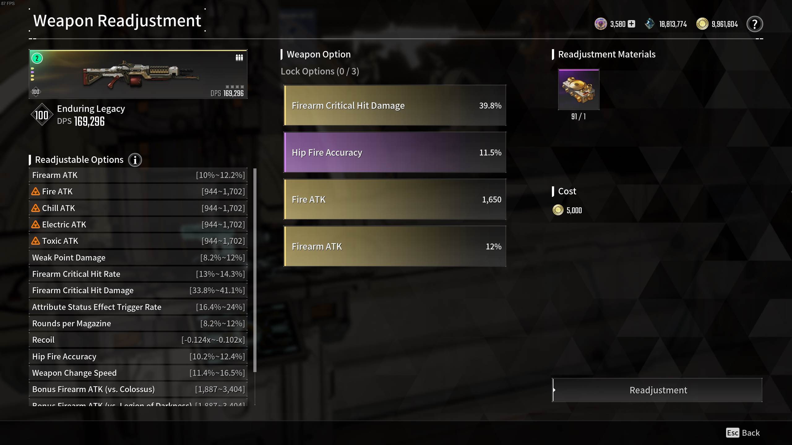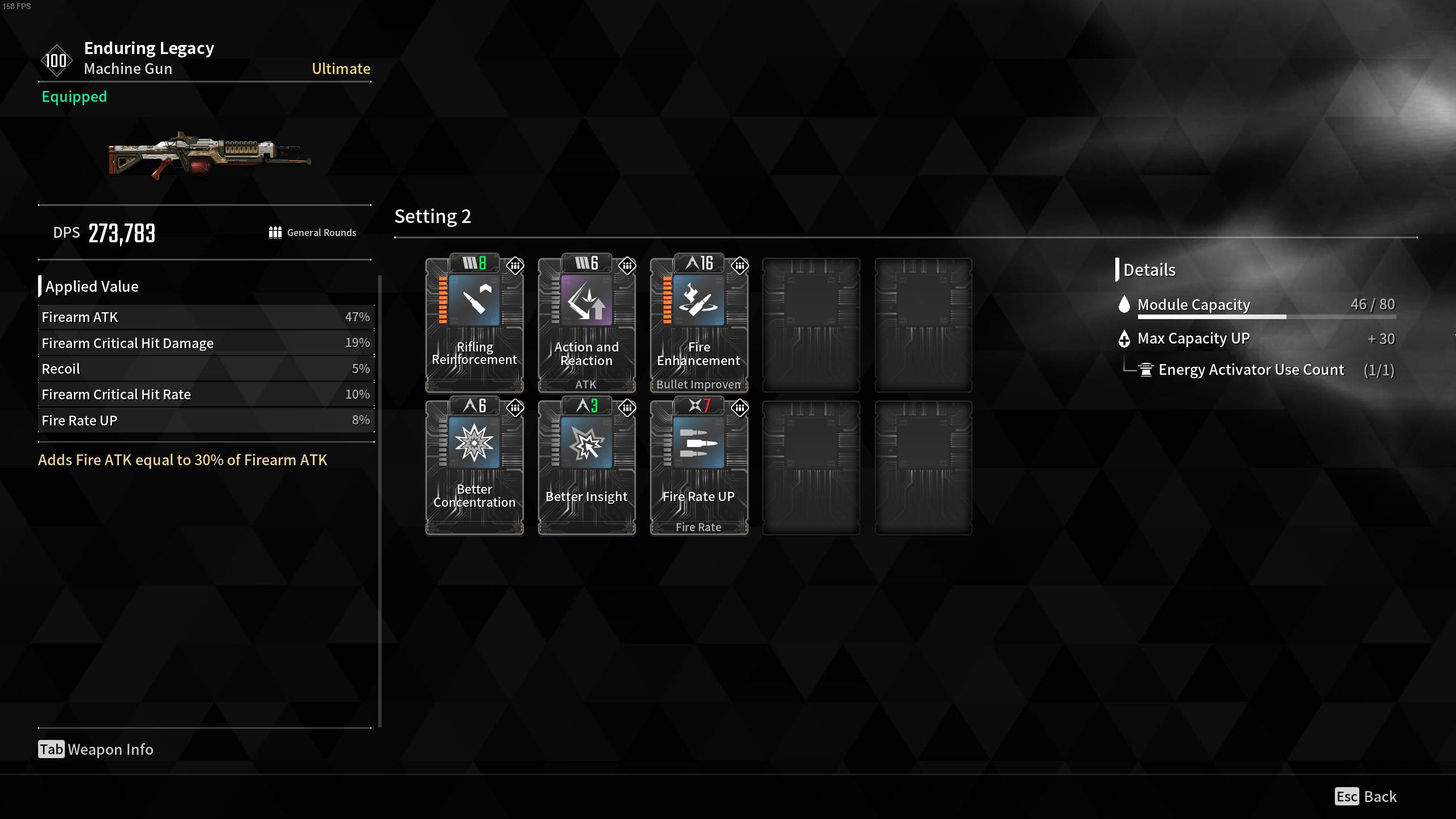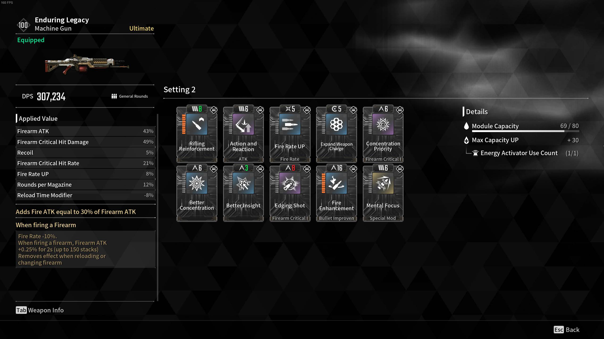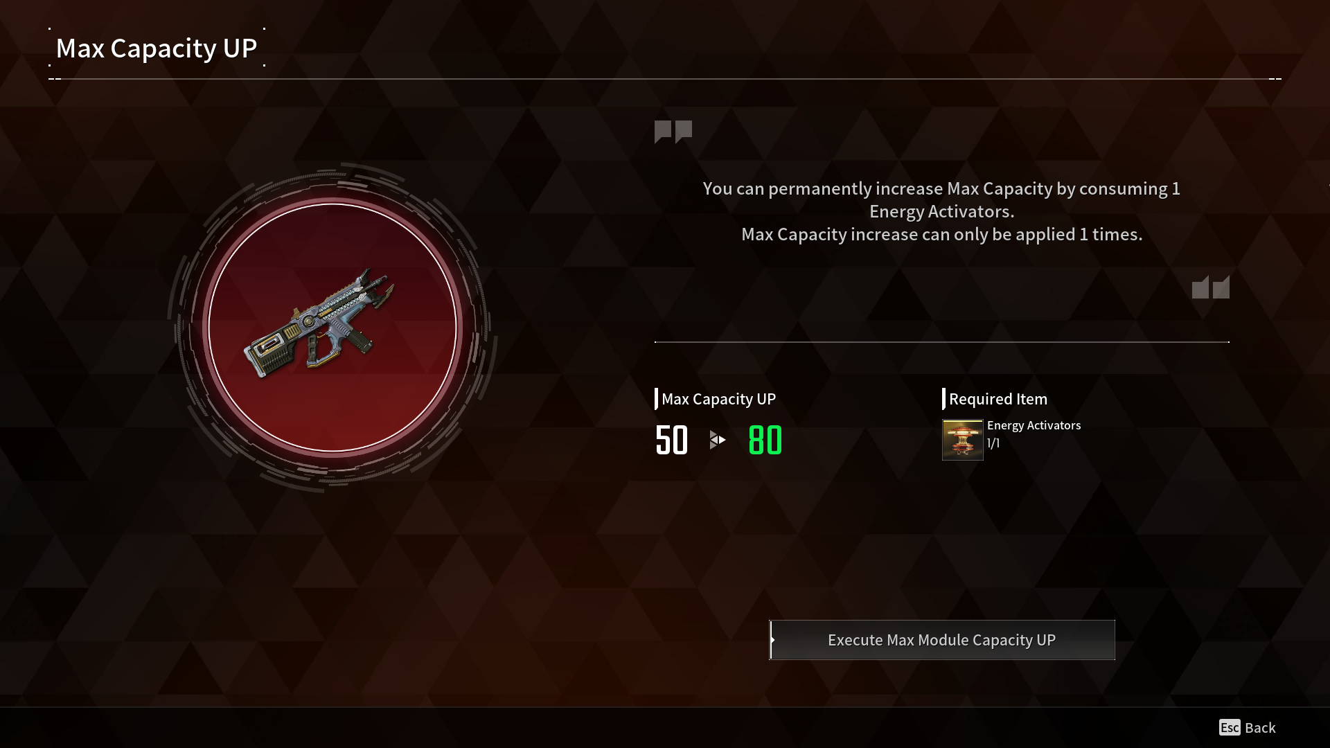 升级武器模组时,请注意成本会增加,最大模块容量为 80。所需材料是能量激活器,在战役结束后您将获得其中之一,或者您可以使用 Anais 制作它们。因此,您想要平衡不断增加的模组,而不是试图最大化每一个模组。枪械攻击力、暴击几率和暴击伤害的平衡方法是最好的(每项+3 左右)。