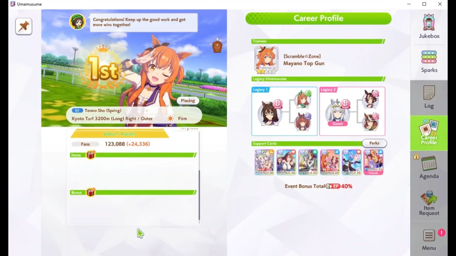尽管是R排名的角色,但Sakura Bakushin O是训练前跑者的最佳和最容易的人之一。她有一个自然20%的速度训练能力,这使您能够始终如一地获得排名a以速度排名SS。但是,您必须使用至少五个速度支持卡来取得最佳效果。此外,请使用一张稀有性的一张塔祖纳(Tazuna)卡,以帮助她在整个奔跑过程中平衡自己的情绪和精力。