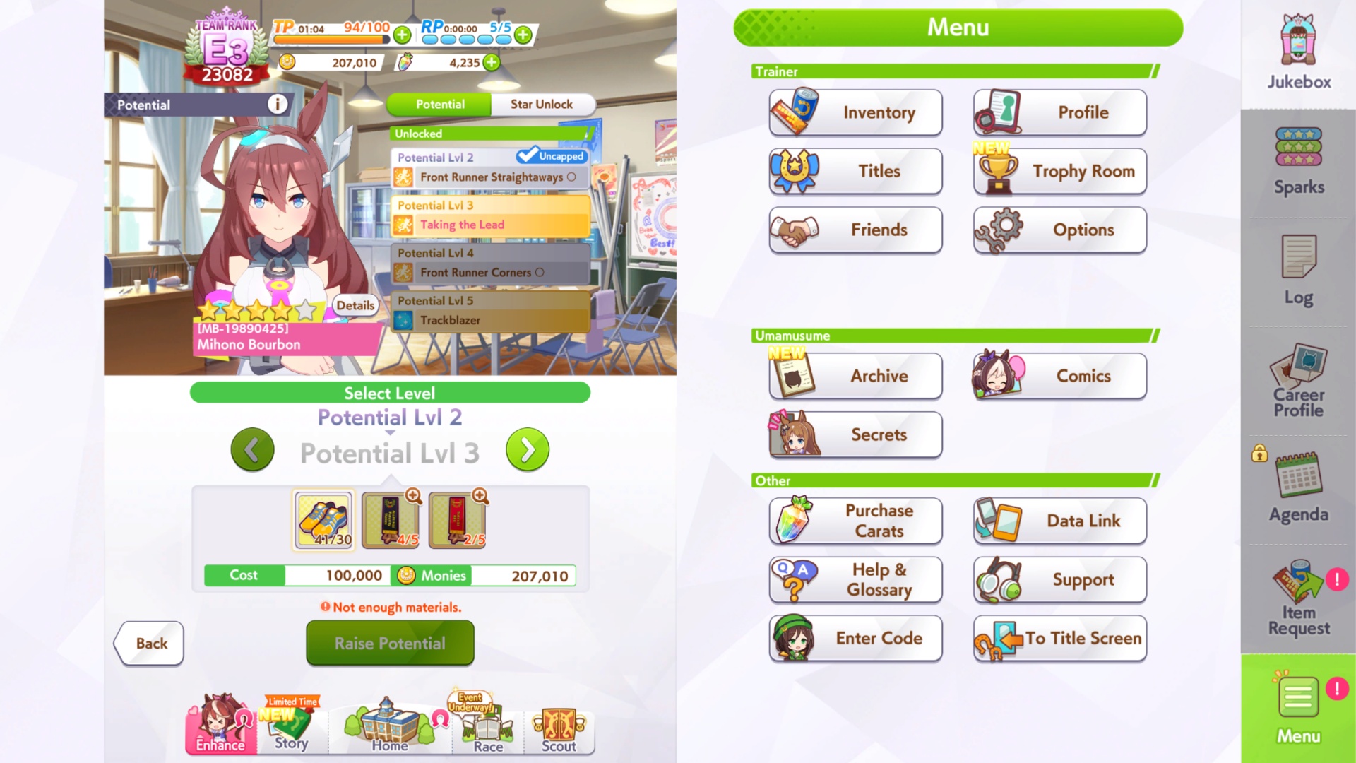 然而,提高潜力水平需要除金钱之外的两种特殊类型的资源:鞋子和获胜者的腰带。通过与您想要升级的 Uma Girl 一起玩 URA Finale 模式,您可以获得不同类型的鞋子。然而,获胜者腰带是通过在不同赛道上获得第一名来获得的。