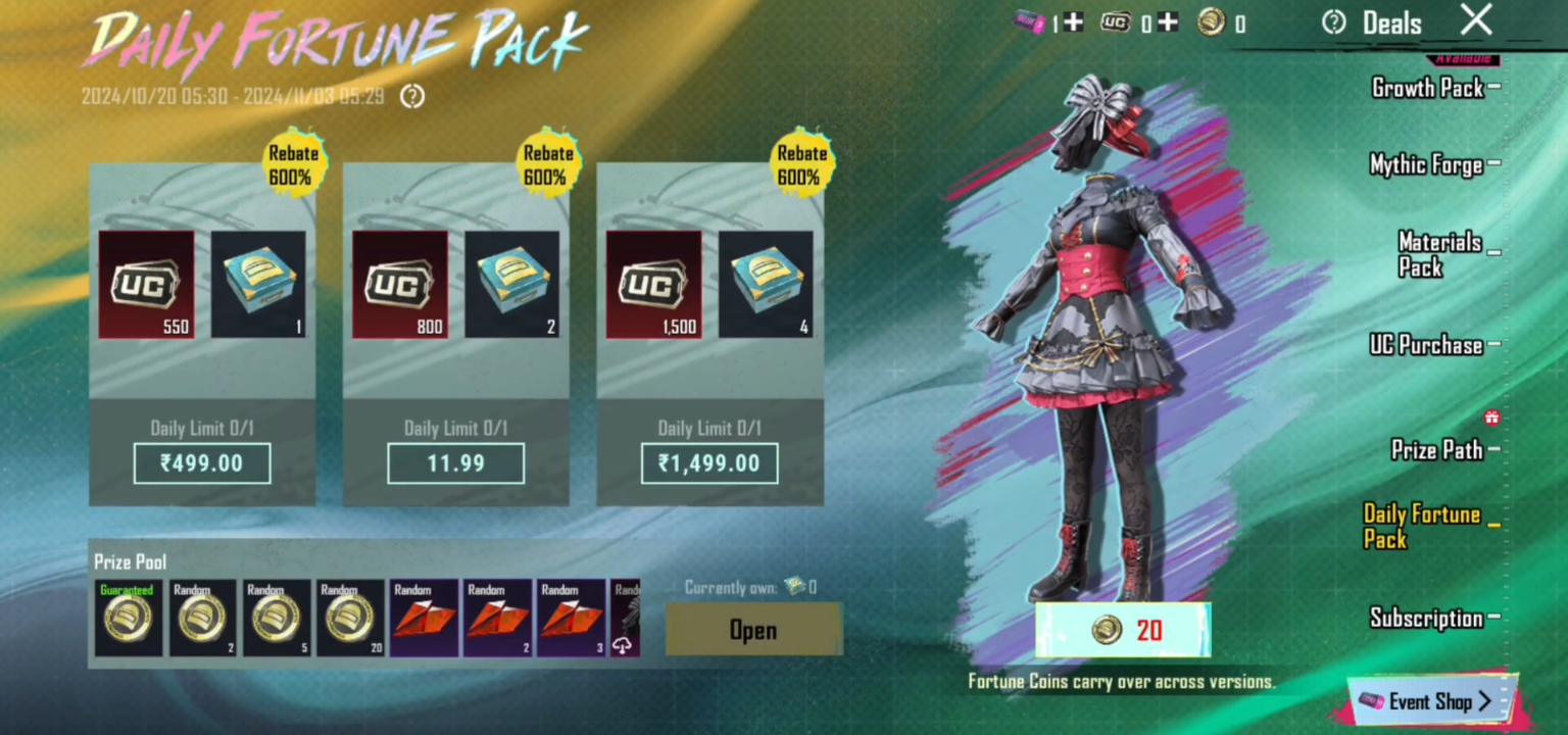 499 印度卢比的每日礼包可以立即为您带来 550 UC,并且通过“每日财富礼包”,您还可以获得更多福利。但请注意,这些包仅产生游戏内物品——没有额外的 UC——并提供独特的物品来进一步定制您的体验。