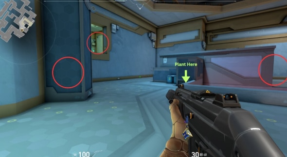 假设您已经完全控制了 A 站点,那么就会出现在哪里放置尖峰的问题。尽管有多种选择,但建议以能够为穗种植后覆盖提供最大角度的方式种植。一些推荐的位置是 A 塔和 A 塔下方的左角,如下图所示,为方便起见进行了标记。不要忘记,你的侧翼和潜伏也在游戏中。