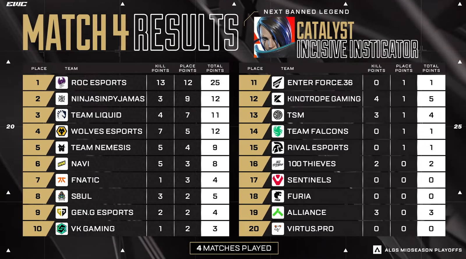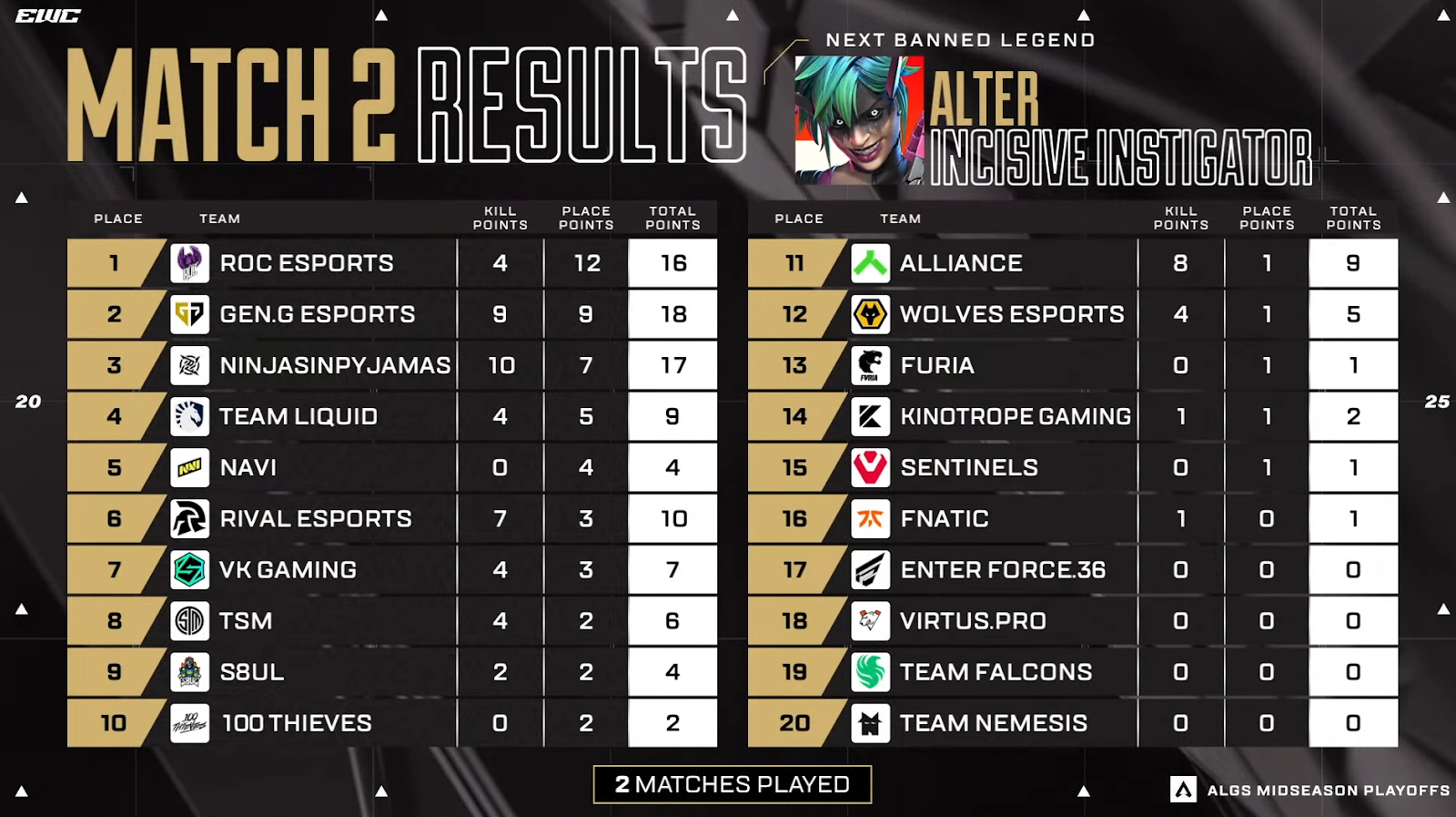 这张地图上,有 8 支队伍击中赛点:ROC Esports(86 分)、NIP(79 分)、VK Gaming(71 分)、Geng.G Esports(69 分)、Team Falcons(61 分)、100 Thieves(56 分)、Wolves Esports(53 分)和 Team Nemesis(50 分)。