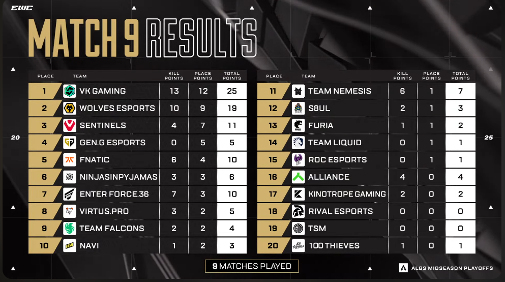 VK Gaming 脱颖而出,获得 25 分,不仅赢得了比赛,还赢得了整个系列赛,使他们以 96 分的总分成为 EWC 2025 的冠军,ROC Esports 获得 87 分。VK Gaming 获得了 3k 冠军积分和 1k EWC 俱乐部积分以及 600,000 美元的奖金池。 ALGS 2025的冠军是中国战队——VK Gaming,当之无愧的胜利。