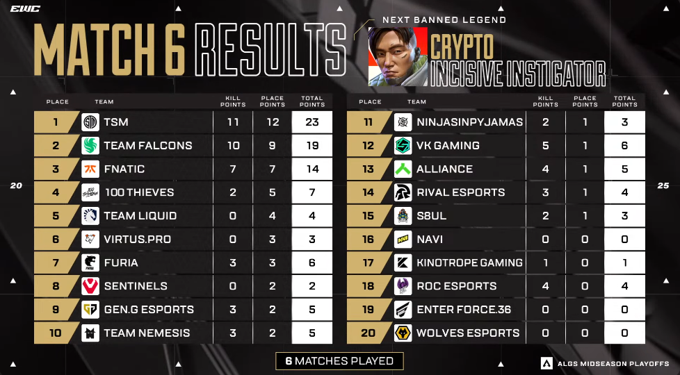 通过这些积分,Team Falcons 拿到赛点,以 52 分排名第四,VK Gaming 积 57 分,Ninjas in Pyjamas 积 67 分,ROC esports 积 72 分。使4支球队获得赛点资格。