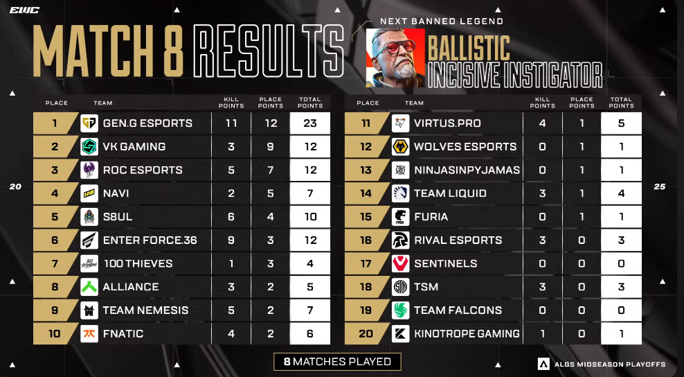 ROC Esports以16分的总积分排名第一。一切都归结为1v1比赛,Gen.G以18分的总分排名第二。联盟排名第11,共获得9分,其中8分是击杀分。 S8ul以4分的总分排名第9,而Team Nemesis则彻底跌落天梯,获得0分,排名垫底。