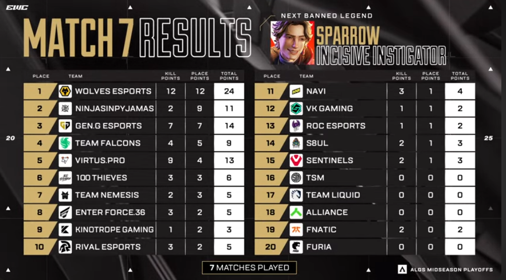 Wolves Esports 和 100 Thieves 并列获得赛点,系列赛总积分均为 52 分。