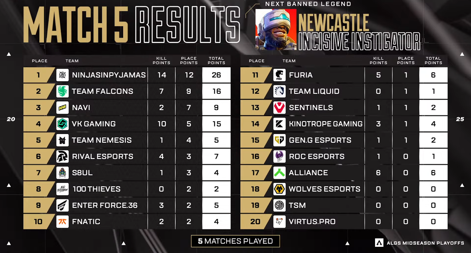 第 5 场比赛还剩 3 支球队处于赛点——Ninjas in Pyjamas、VK Gaming 和 ROC Esports。在该系列赛中,ROC 获得 68 分,Ninjas in Pyjamas 获得 64 分,VK Gaming 获得 51 分。