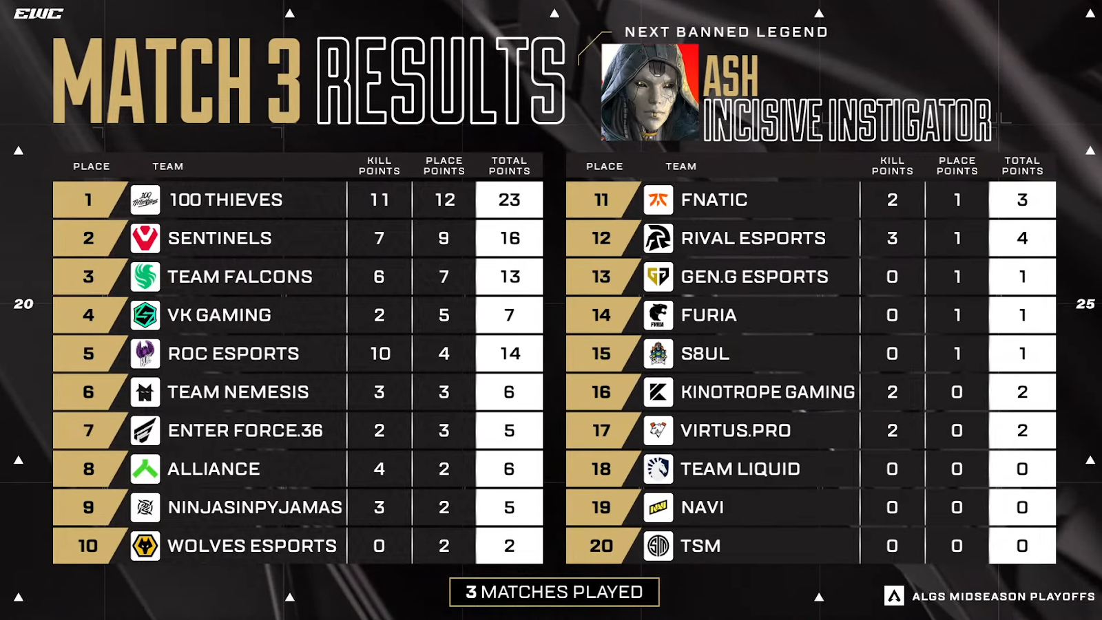 100 Thieves 最终以 23 分获得第一名,而 GEN.G 则以 1 分的总分跌至第 13 位。 Team Liquid、Navi 和 TSM 在第 3 地图中获得 0 分。