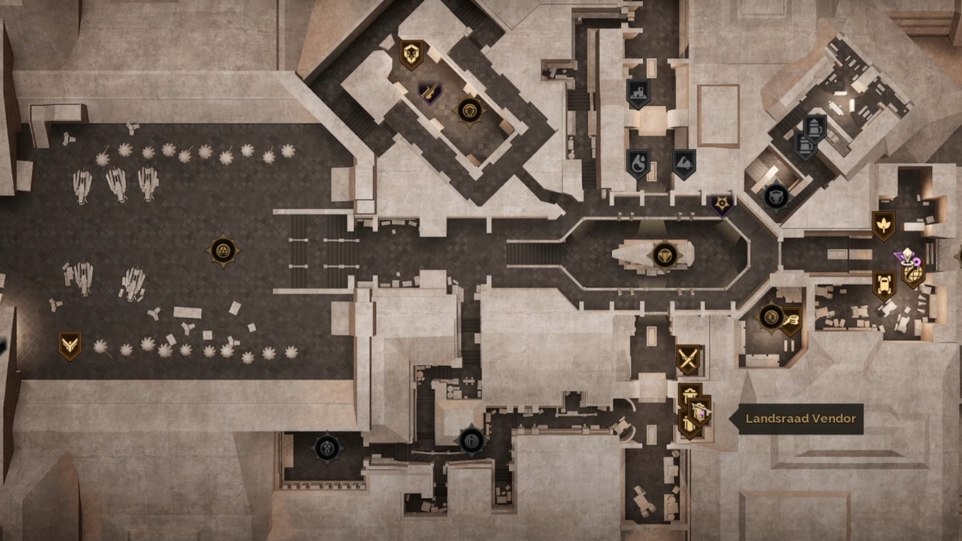 如果你的公会服务于阿崔迪家族,你会想要前往阿拉肯与你的兰德斯拉德供应商会面。为此,只需乘坐扑翼飞机(无论是您自己的还是租用的)飞往该地点即可。到达枢纽后,向前行驶并从中央大厅区域左转。当你穿过左边的武器供应商后,你会在同一侧找到另一个房间。那是所有兰兹拉德商贩所在的地方。