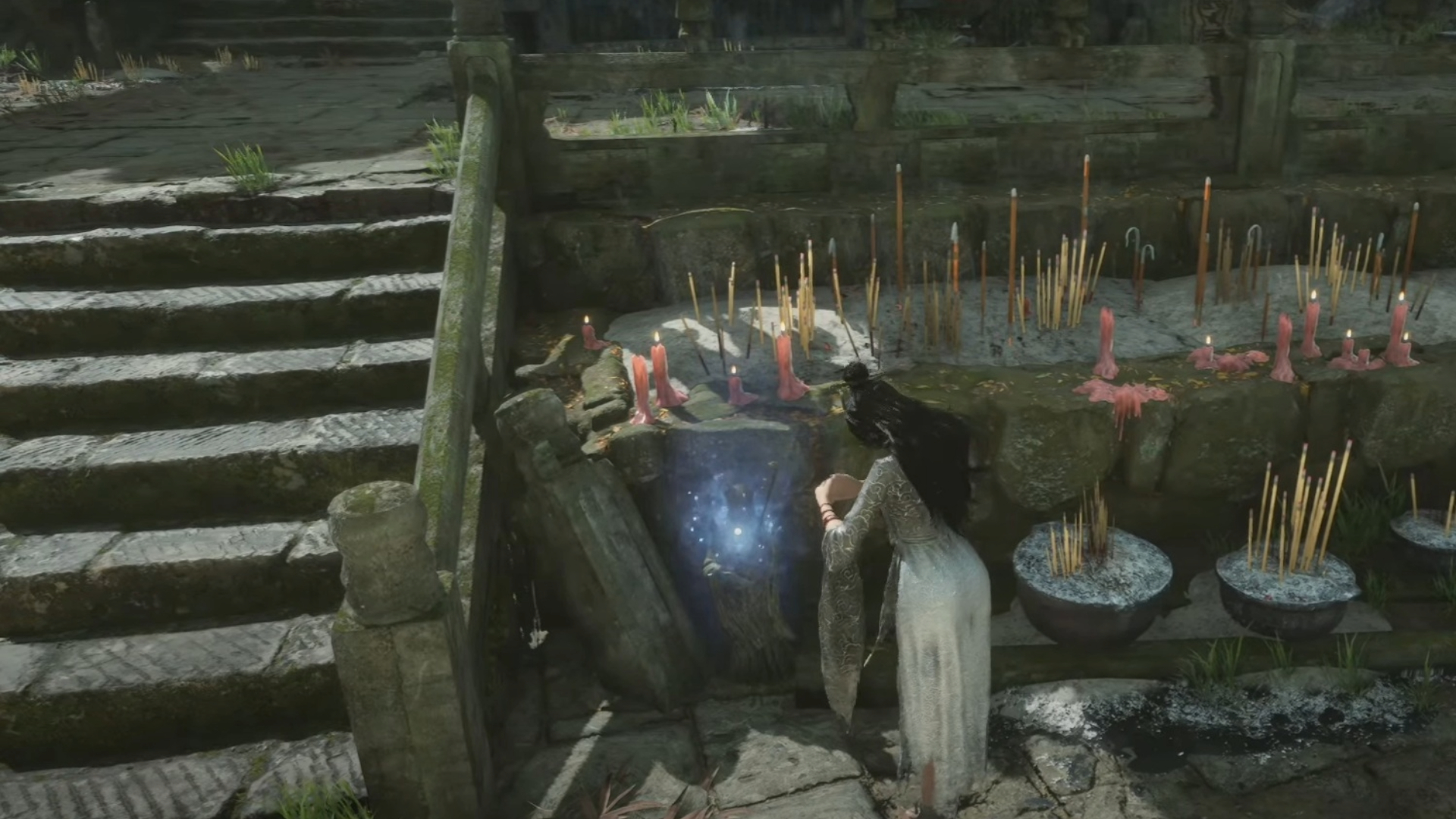 对于第二个,你需要退出蜀圣殿主建筑。就在外面,您应该能够在蜀神雕像附近发现蓝色的光芒。与它互动,它会告诉你向上帝致敬。为此,请选择崇拜选项。完成后,再次与蓝色发光物品互动以拾取神圣礼物。