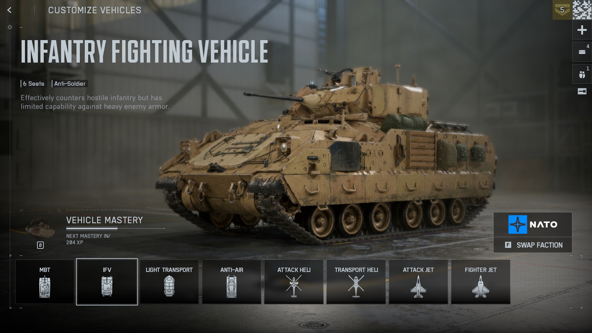 步兵戰車是主戰坦克的更快版本。該坦克有六個座位,並提供良好的進攻選擇,例如自動加農炮和榴彈發射器。但該載具在與敵方重型裝甲作戰時,傷害輸出並不強;因此,它最好用作支援車輛。
