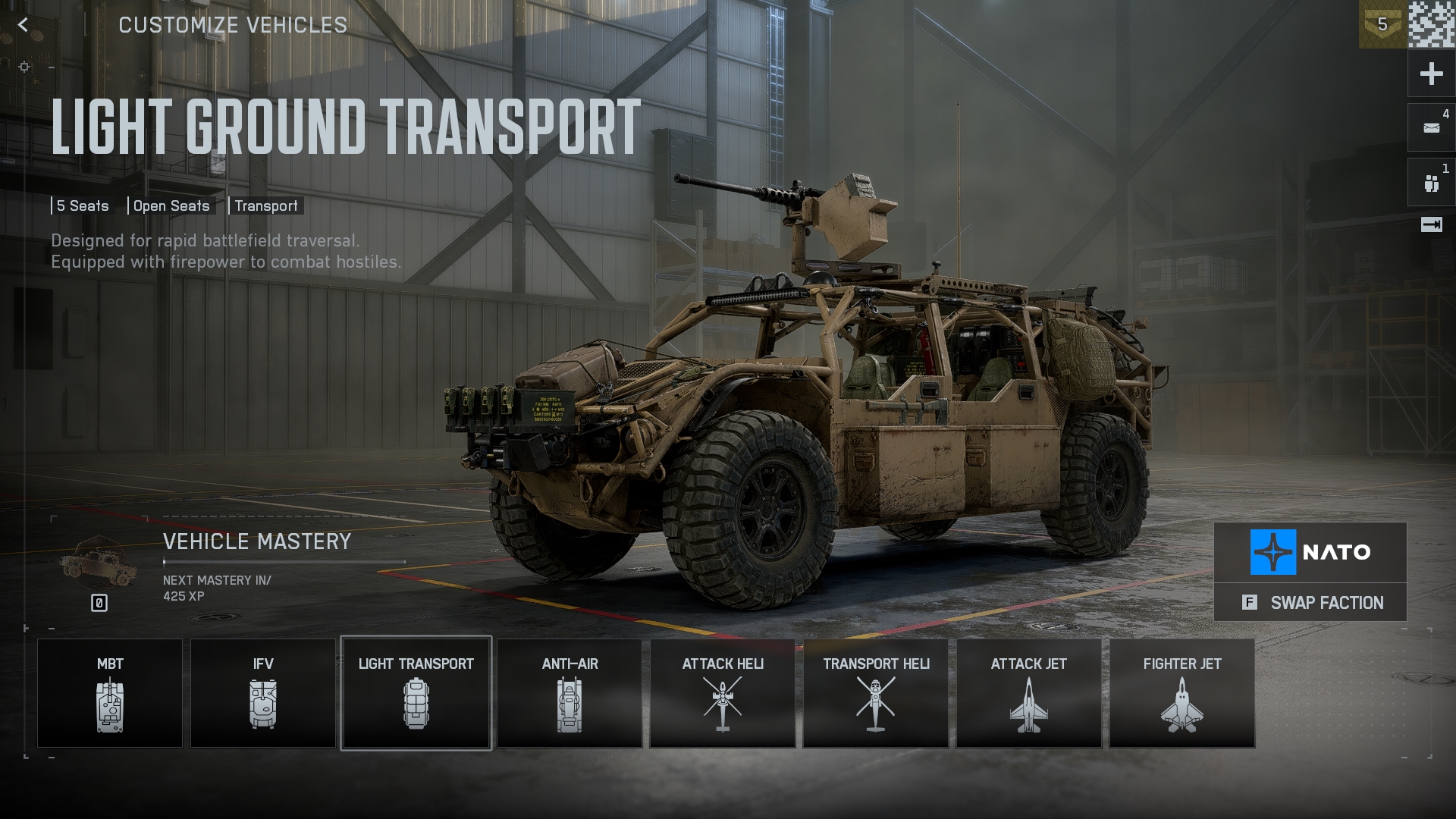 標準四輪車,機動性強,但沒有裝甲支撐。輕型地面支援車通常用於快速穿越地圖。它有五個座位,頂部安裝了一個 MG。使用這輛車來側翼攻擊敵軍或協助你的盟友。
