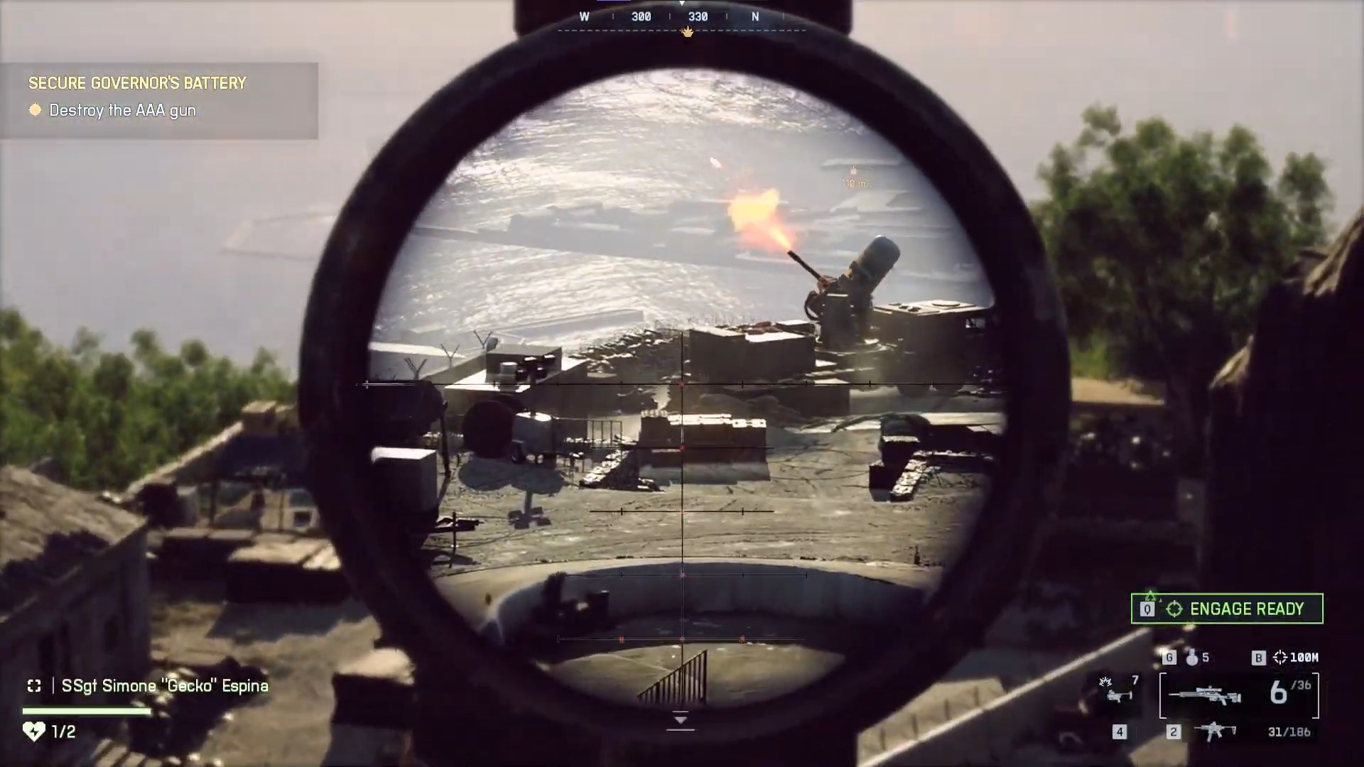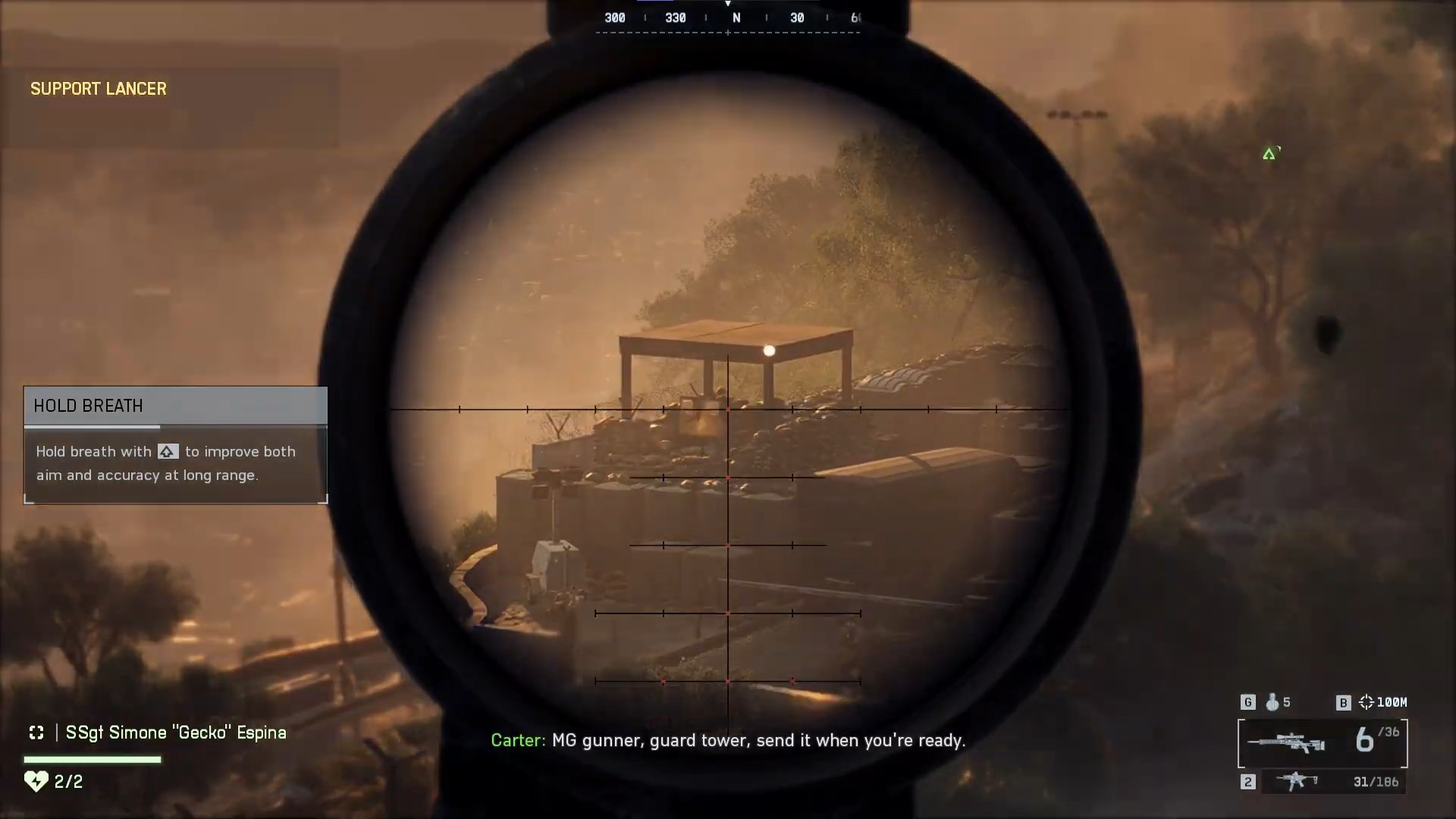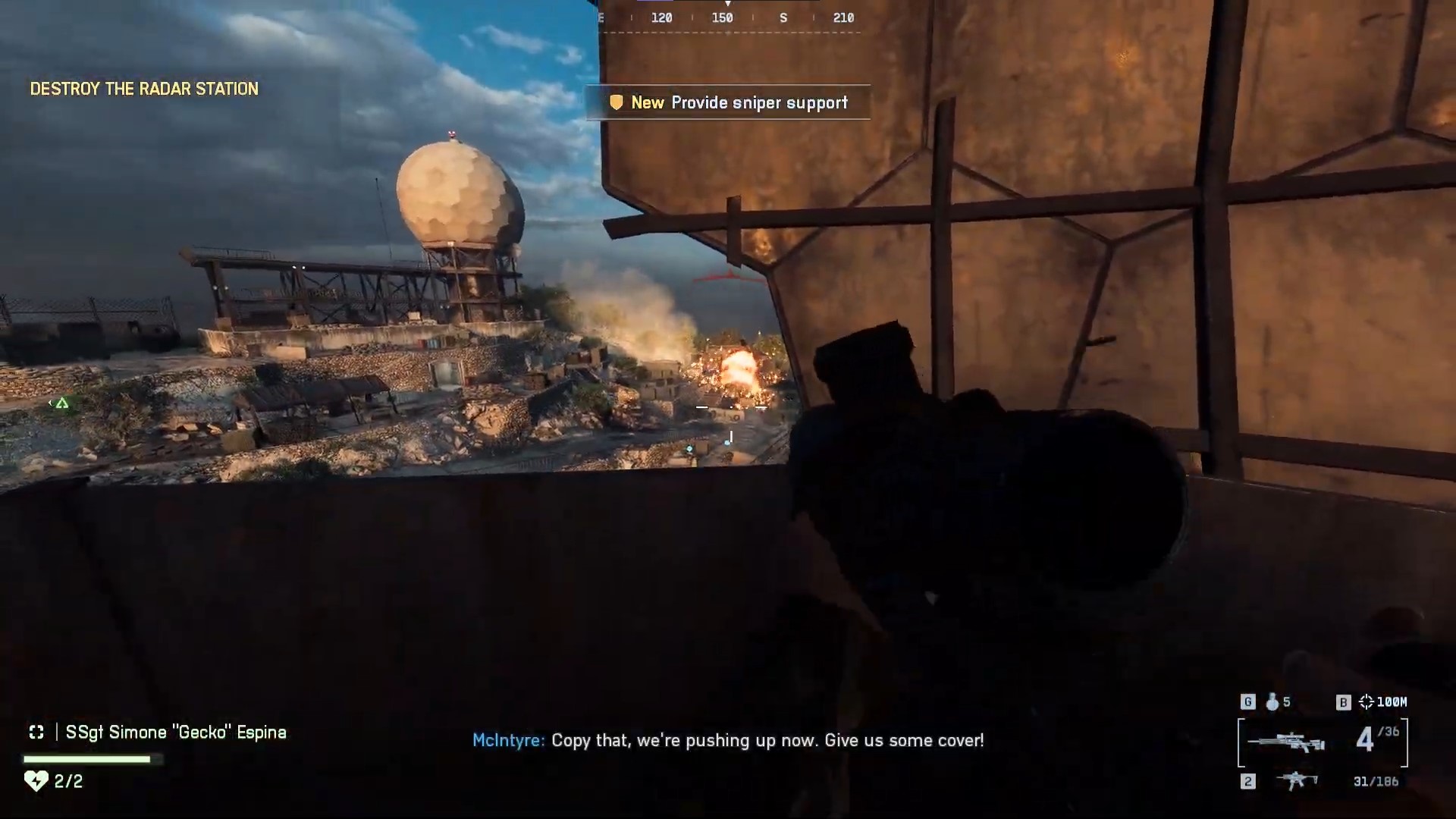 是時候進行另一場狙擊手掌握課程了。使用你的狙擊步槍對雷達站發起攻擊。殺死所有可見的敵人後,前往車站爬上塔樓。利用這個有利位置為您的團隊提供狙擊手支持。首先乾掉 RPG 士兵以避免造成致命傷害。之後將你的注意力轉移到敵方直升機的支援上。 Lancer 和他的團隊將設置炸藥摧毀雷達站,完成你的第二個目標。