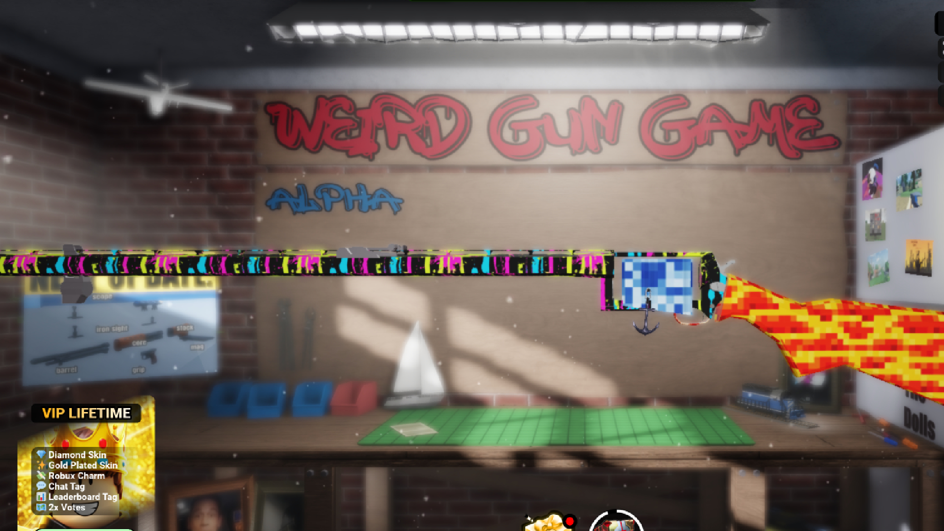 怪異槍遊戲的獨特機制之一是能夠定制和建造你的槍。與 Roblox 上更傳統的死亡競賽射擊遊戲不同,玩家可以建造槍支部件,並可以自由地混合搭配不同的握把、噴嘴和槍管,以製作自己選擇的武器。它可以是步槍、狙擊槍、衝鋒槍或霰彈槍。