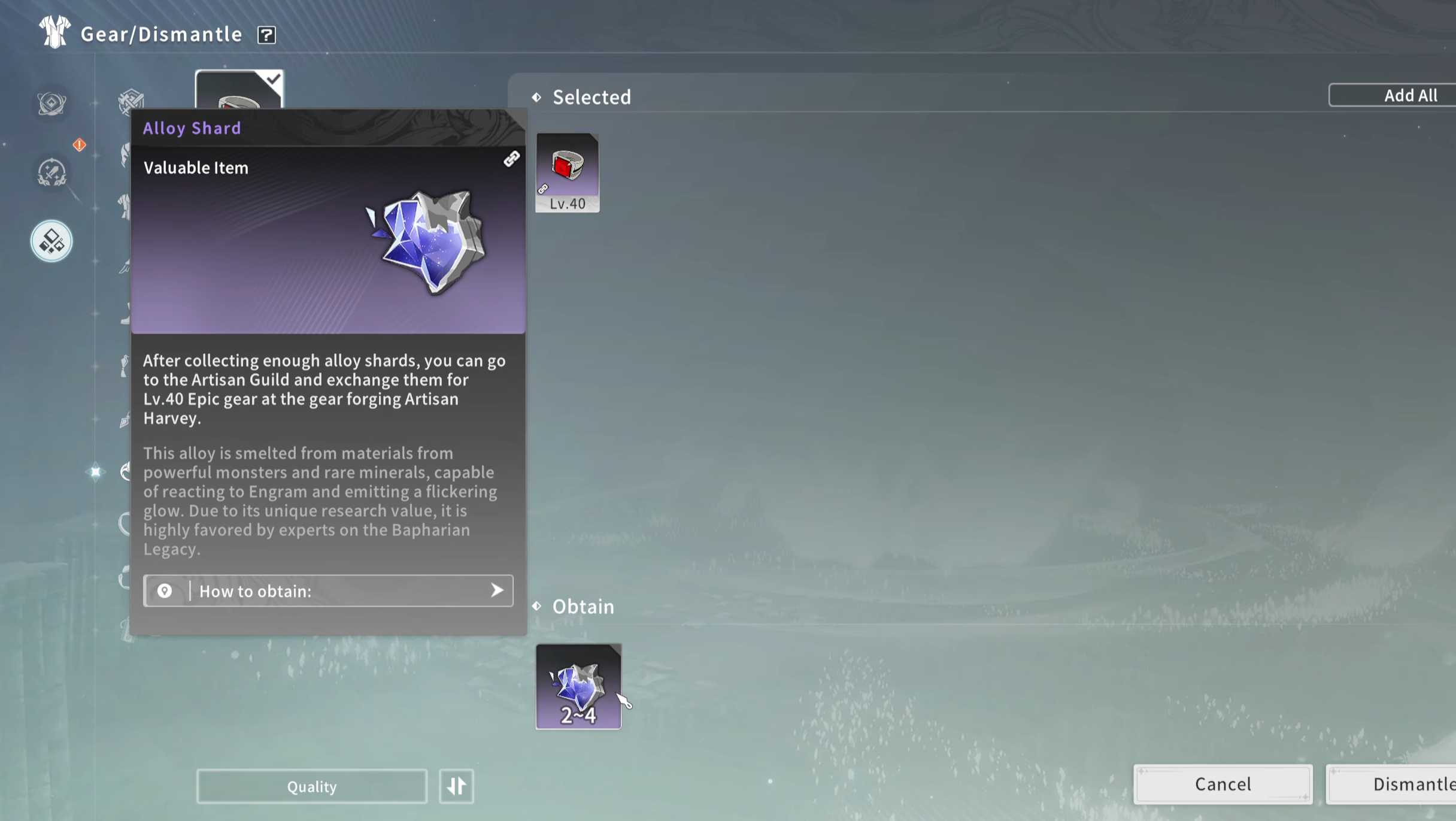 合金碎片的主要目的之一是將它們兌換成工匠公會的高級裝備。要進行這些交易,您可以與齒輪鍛造工匠哈維交談,他可以在主城的工匠區找到。他的工作站位於齒輪增強工匠馬克西姆附近,你也可以出於相反的目的接近他,即交換材料以獲得合金碎片。