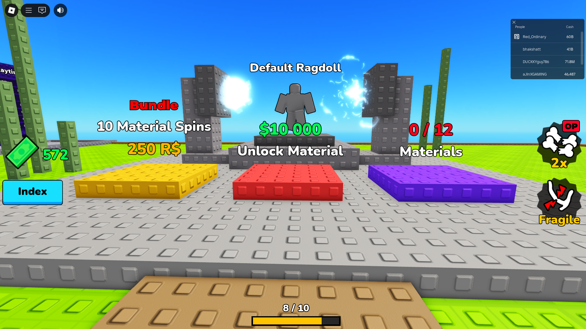 材料充當在擲骰過程中應用的乘數或特殊效果。您可以通過生成區域中的材質旋轉獲得它們。使用次數越多,每次旋轉的費用就會越高,上限為 100,000,000。材料可以與其他修飾符疊加,例如重生獎勵或朋友乘數。