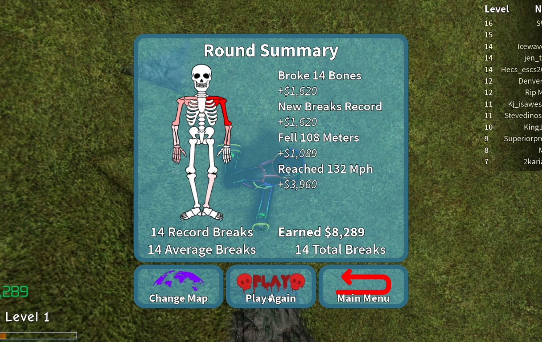 一旦你撞到地面,你就會看到你的統計數據彈出在屏幕上。它將顯示您骨折的骨頭數量以及受傷的部位。根據你造成的傷害程度,你將獲得現金。