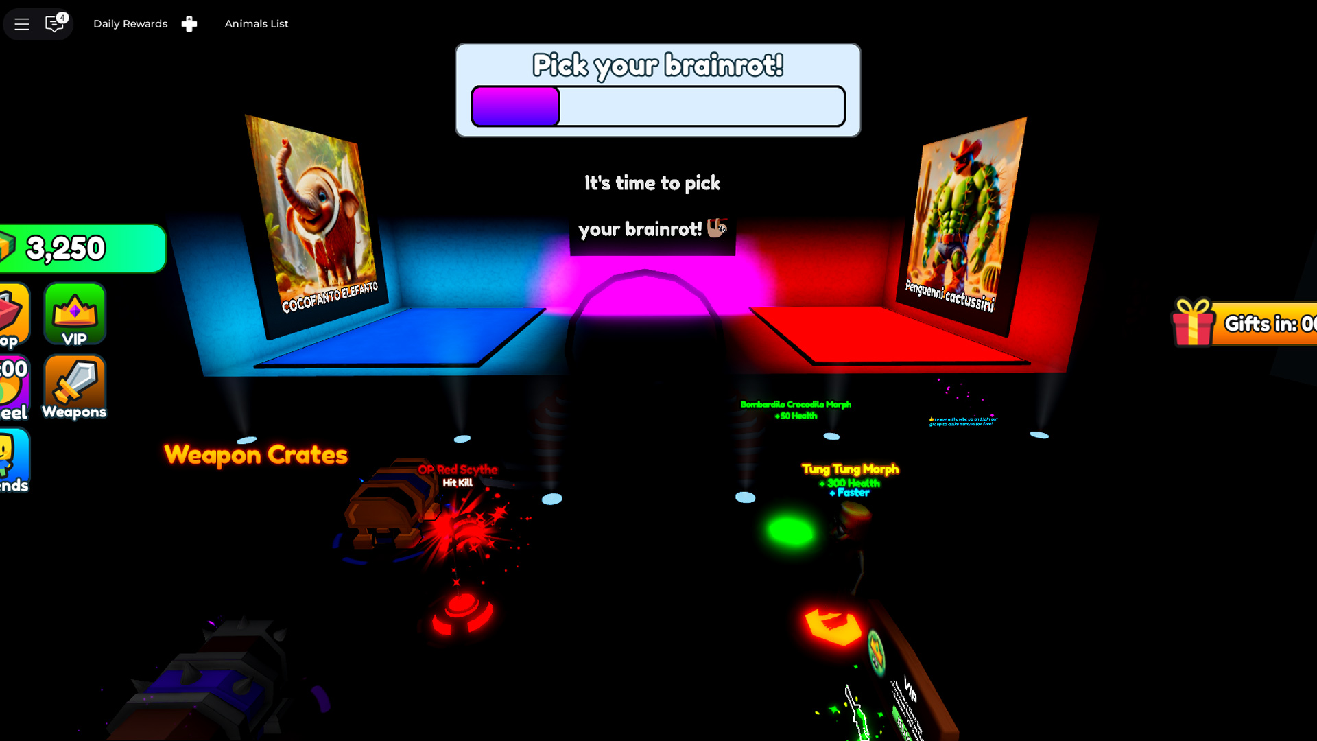 首先,您將與其他玩家一起進入大廳。在一輪開始之前,將顯示來自意大利 Brainrot 模因的兩張圖像。接下來,您必須選擇自己的立場並前往藍色或紅色平台。一旦選擇了陣營,就無法切換。將有一個五秒鐘的計時器,之後您將不得不與另一支隊伍戰鬥。球隊可以容納盡可能多的球員。