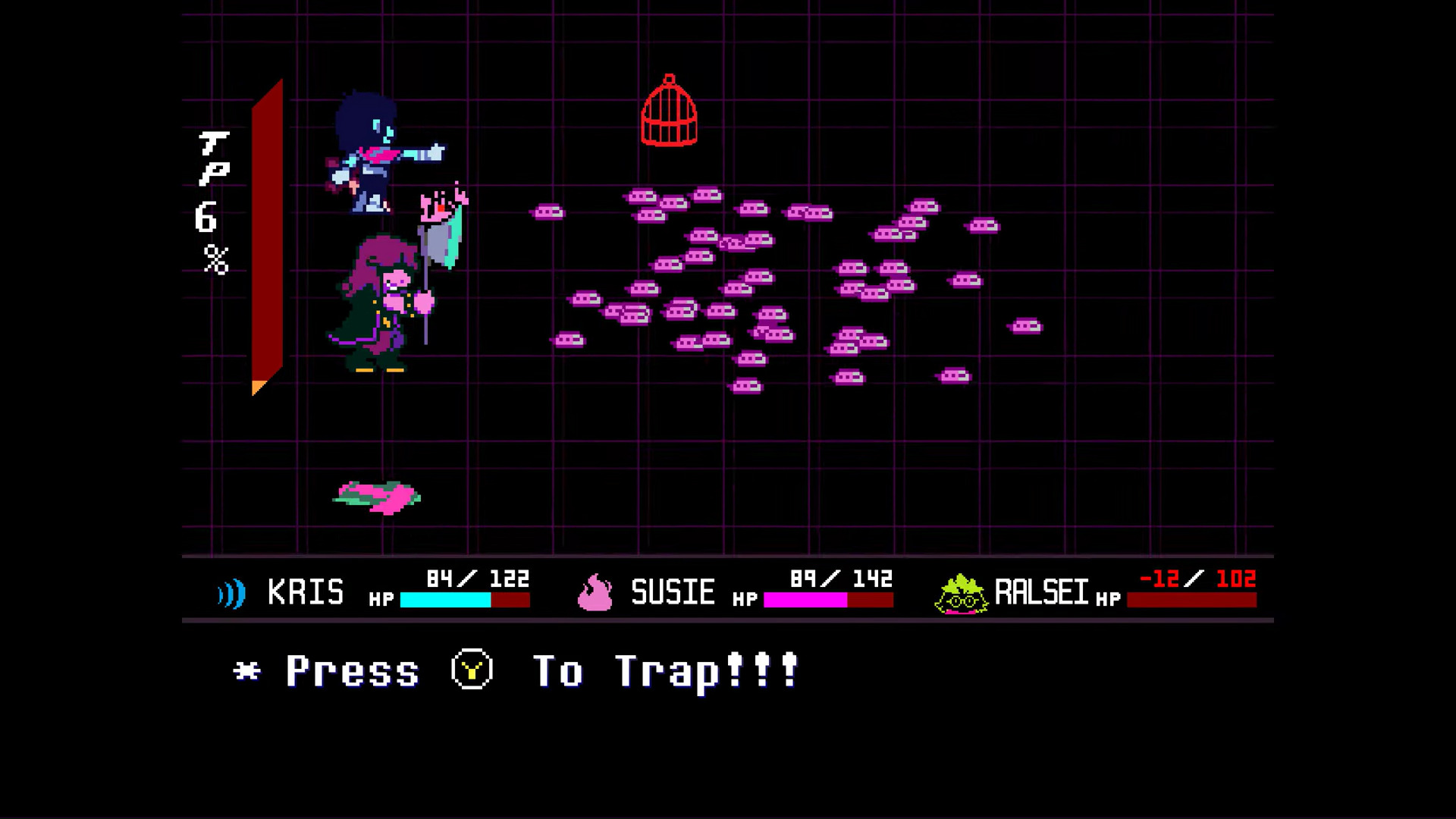 然而,如果 Rasiel 或 Susie 被擊倒,則 Catch X 將不可用。相反,Kris 必須使用 ACT 的較弱版本,稱為 Catch。這與第一個動作的功能相同,但您使用較小的籠子。