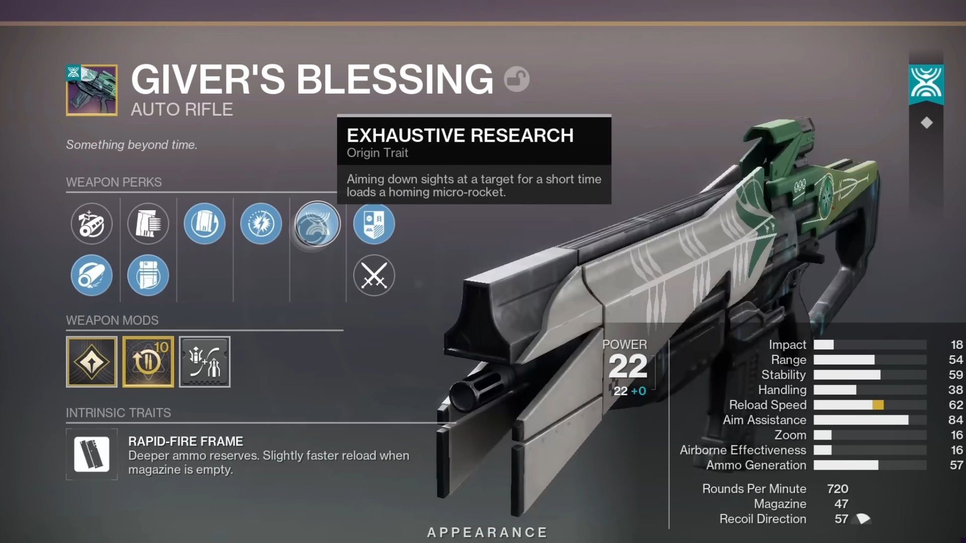 對於所有六種目標武器,起源特徵是詳盡的研究。這一特性允許武器在每次瞄準敵人時裝載並發射微型導彈。微型導彈需要一些時間來裝載,但一旦裝載完畢,下次扣動扳機就會釋放導彈而不是普通彈藥。此外,你可以用這種導彈造成相當嚴重的傷害。由於它沒有傷害衰減,你甚至可以用它來用其他武器無法擊倒遠距離的敵人。