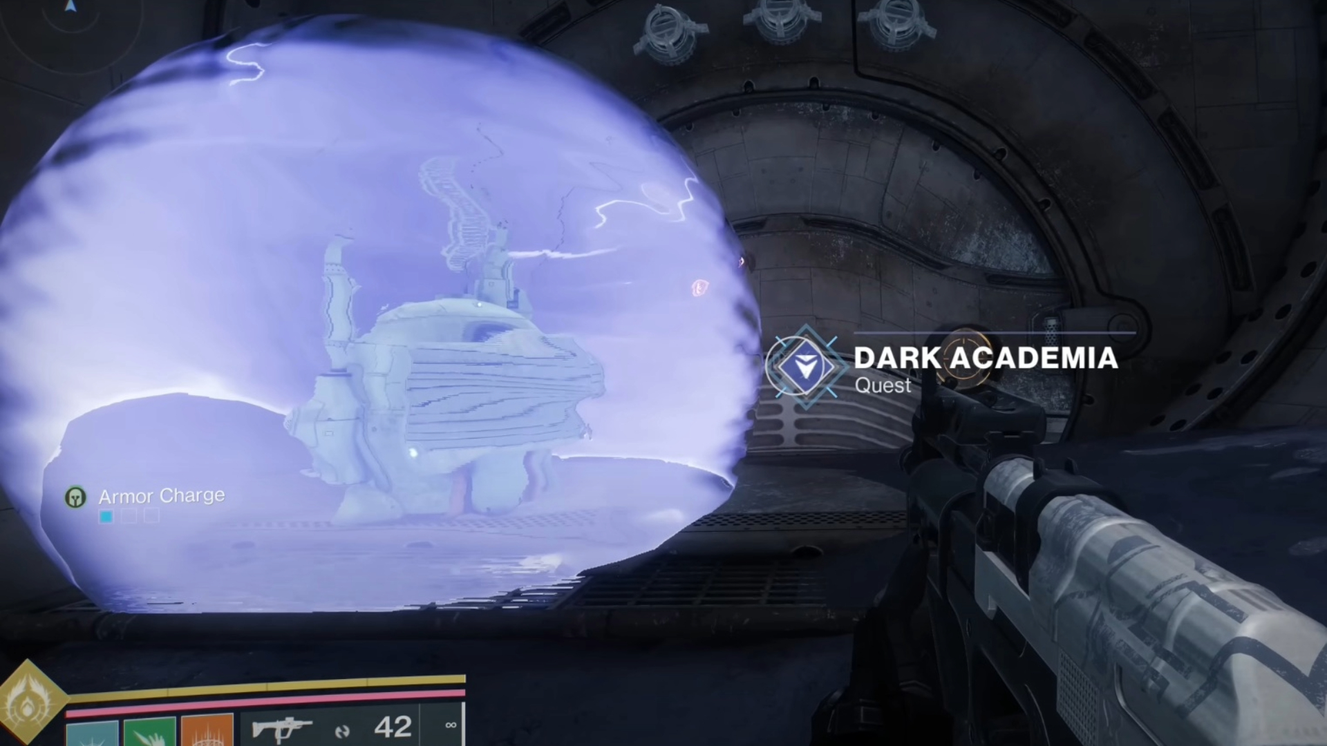 現在所有的保險絲都在下降,門旁的塔架周圍的屏蔽已經消失了。但是,您仍然必須過度向塔架收費,以打開Destiny 2的命運邊緣的黑暗學術門。為此,您需要MatterSpark。您可以在此處的兩個可能位置之一中獲取Matterspark。第一個選擇是從火車上的上方獲取它。另一個選項,我們喜歡的選擇是從管道地板附近的二樓上方抓住它。有了Matterspark活動,您可以將塔架拉開,門將飛行。