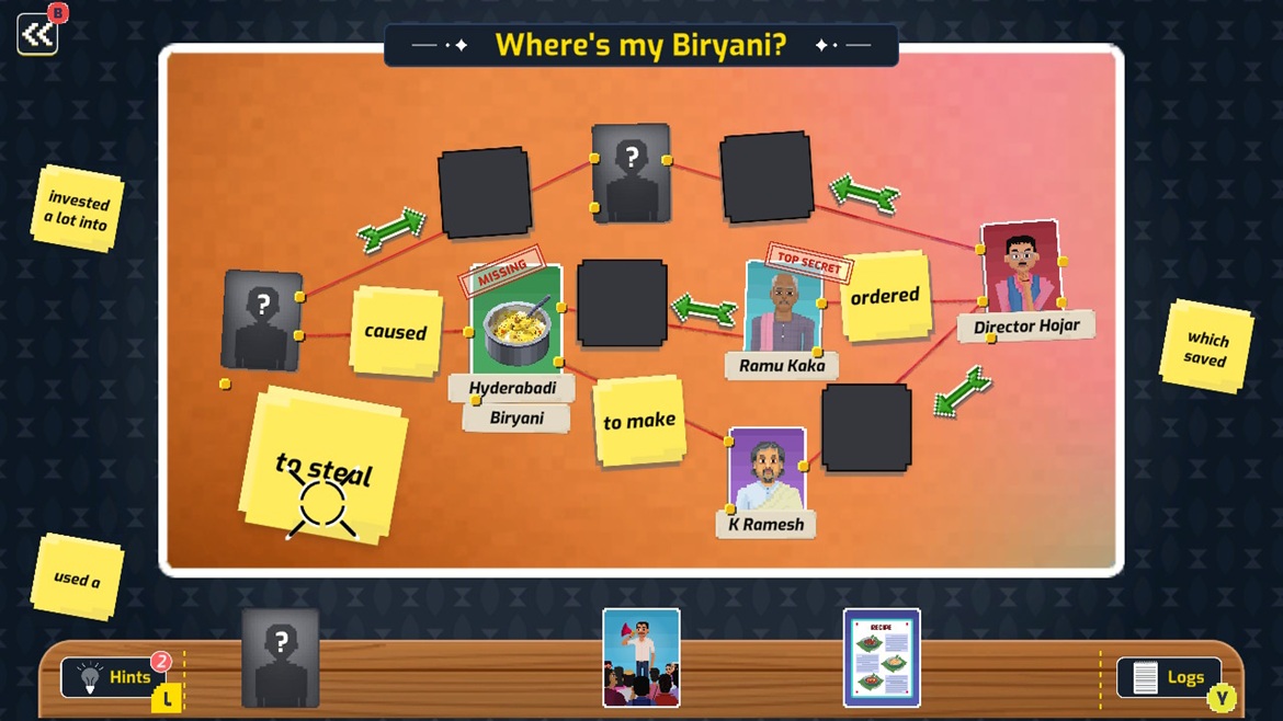在拖放證據板上構建您的案例,以連接線索和提示,並在您遇到困難時提供提示。