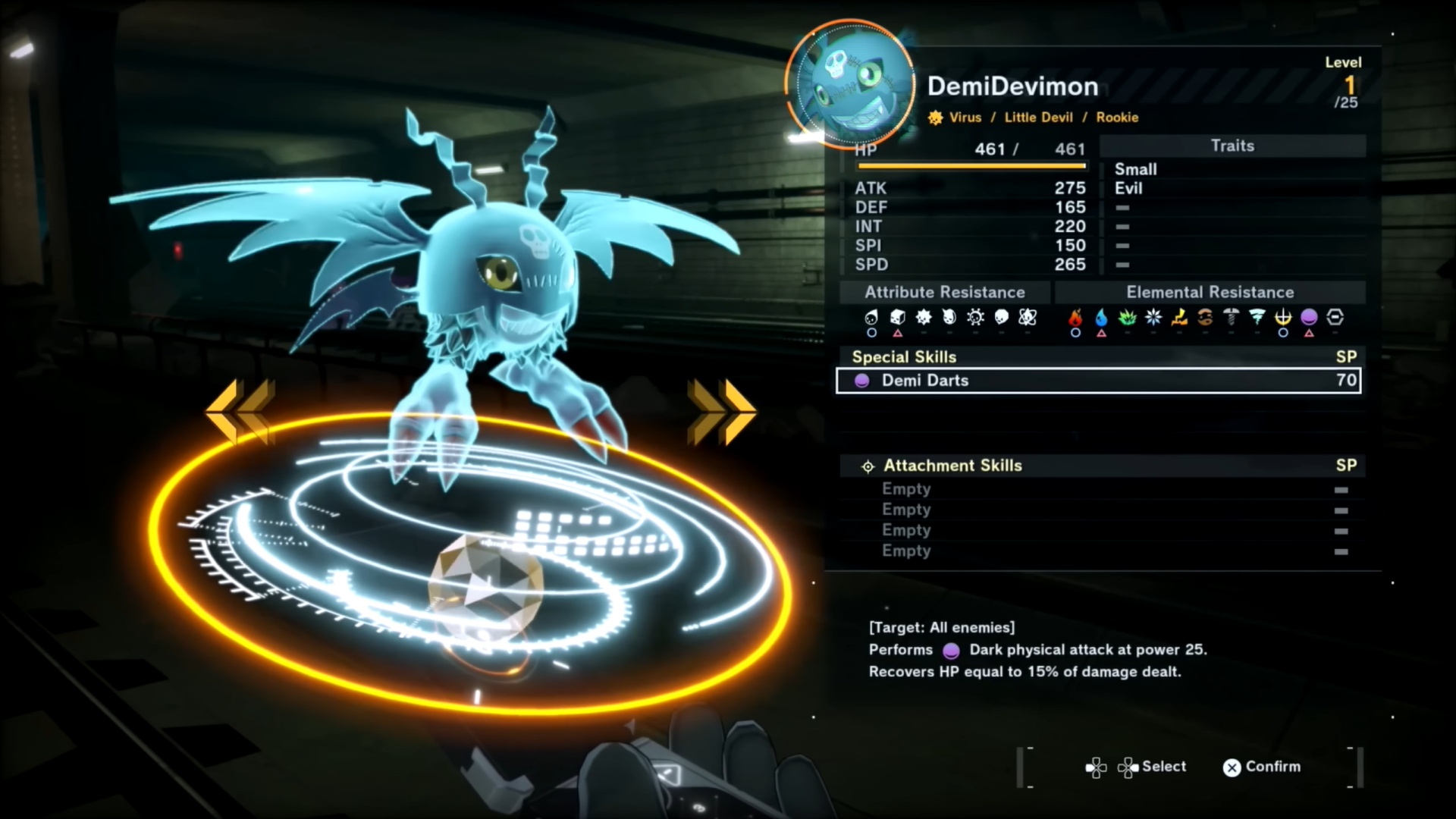 儘管選擇什麼數碼獸並不重要,因為你可以在尾聲中獲得所有數碼獸,還是建議選擇半惡魔獸。這樣做的原因是半惡魔獸擁有半飛鏢攻擊,具有吸血效果。這對於其他介紹任務的推進很有用。