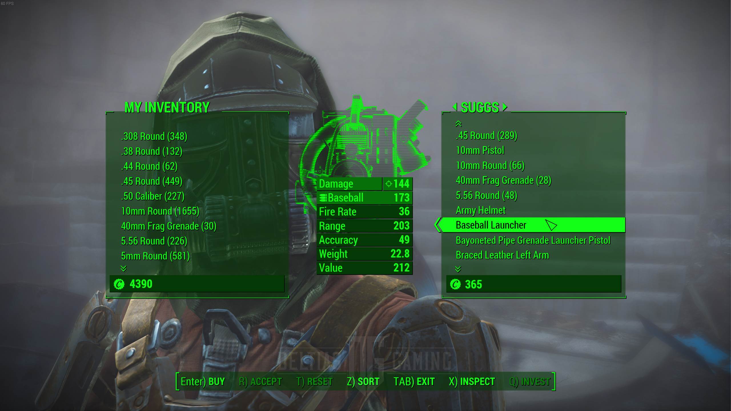 如果您不想在《輻射 4》中執行任務或不小心放錯了棒球發射器,您可以直接從 Suggs 購買。前往他在劍橋的商店位置並在對話選項中選擇易貨貿易將打開商店並允許您購買武器。這並不是一件非常昂貴的武器,只需要212個瓶蓋。