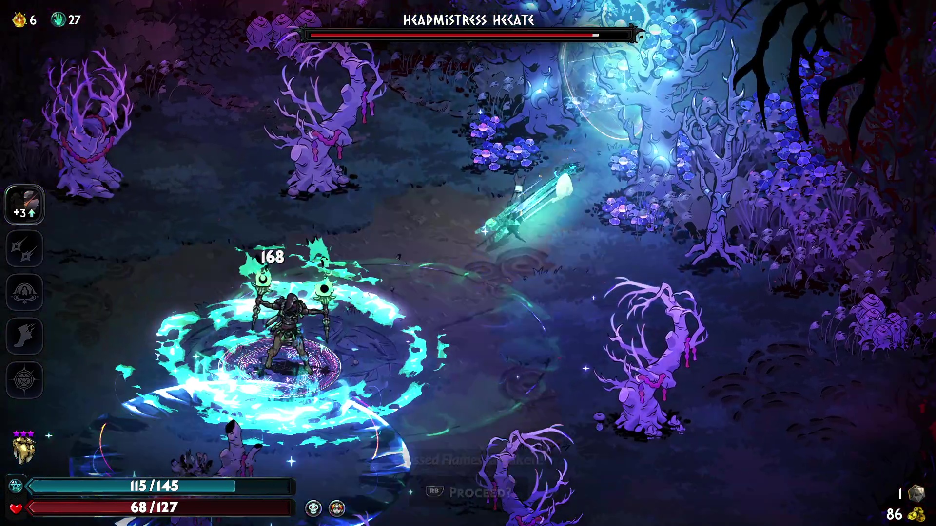 - 當赫卡忒施放交叉火焰攻擊時,她將很容易受到任何遠程攻擊。使用你的特殊技能造成盡可能多的傷害。如果你裝備了赫爾墨斯的恩賜,你可能會在這段時間內獲得四個特殊物品,具體取決於你的總魔法能力。