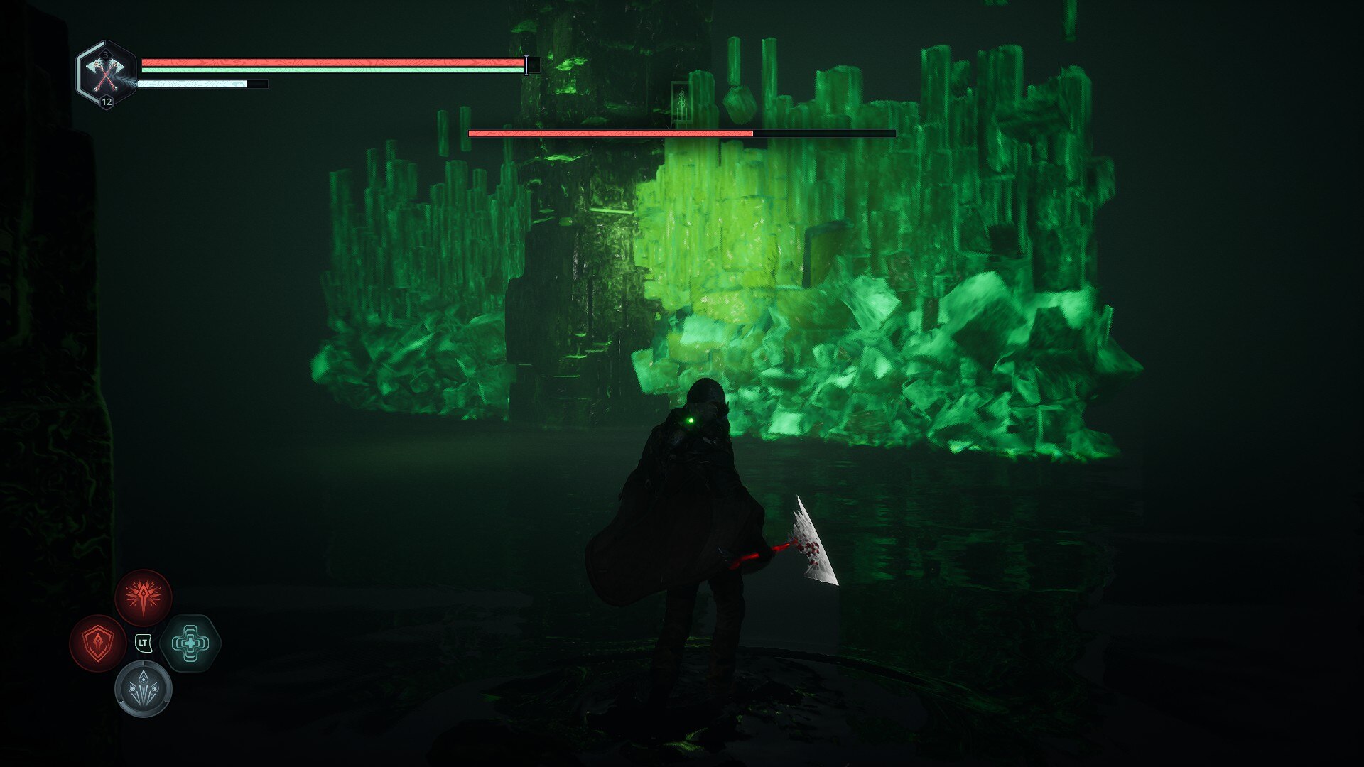 - 對於 Boss 戰的第一階段,您需要找到以下支柱:出現故障與一個綠霧。擊中這些柱子將揭示恐怖之霧的位置。請注意,在 Boss 出現之前,您需要找到至少三個支柱。