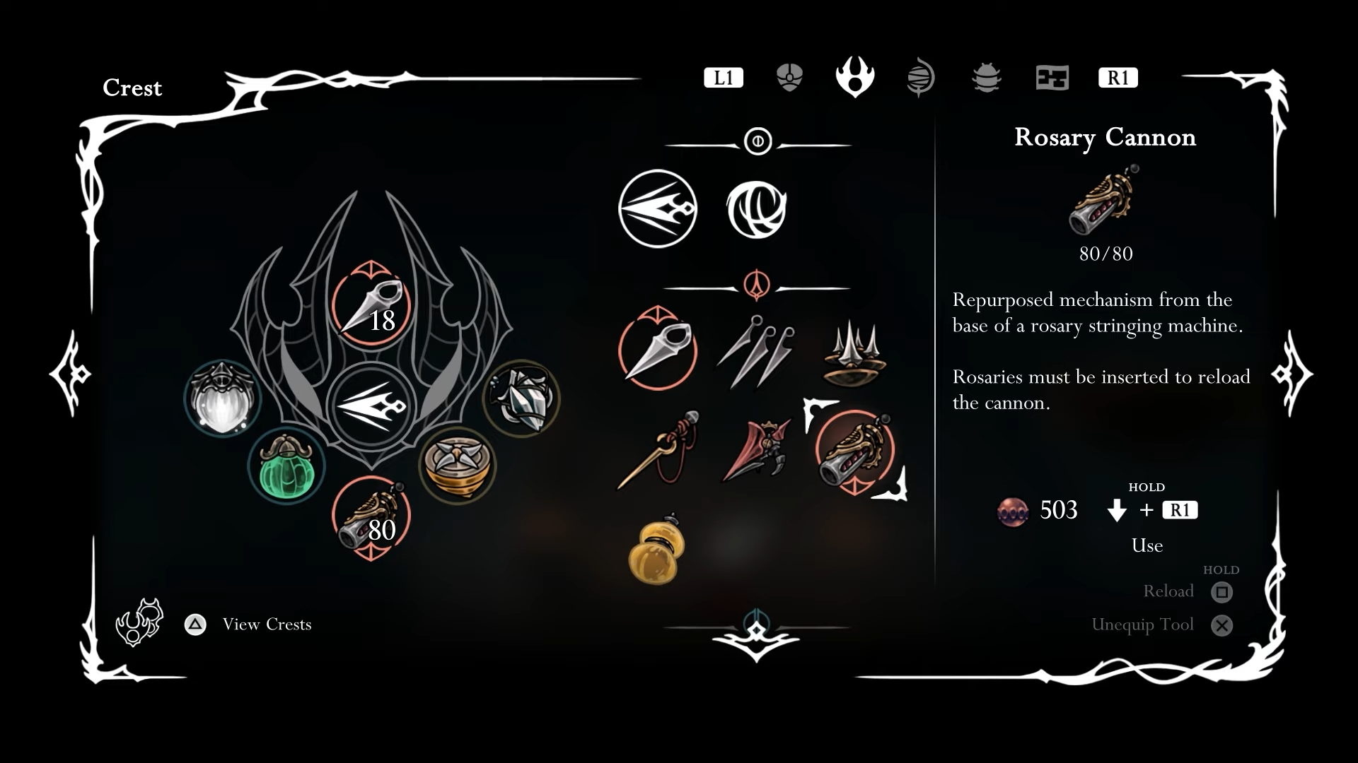 念珠炮的功能類似於《空洞騎士絲歌》中的加特林機槍或迷你槍。當你使用它時,大黃蜂使用念珠作為彈藥,它會以極高的精度和速度向你瞄準的方向發射它們。雖然這會造成巨大的傷害,但它的主要缺點是它會耗盡你的念珠。
