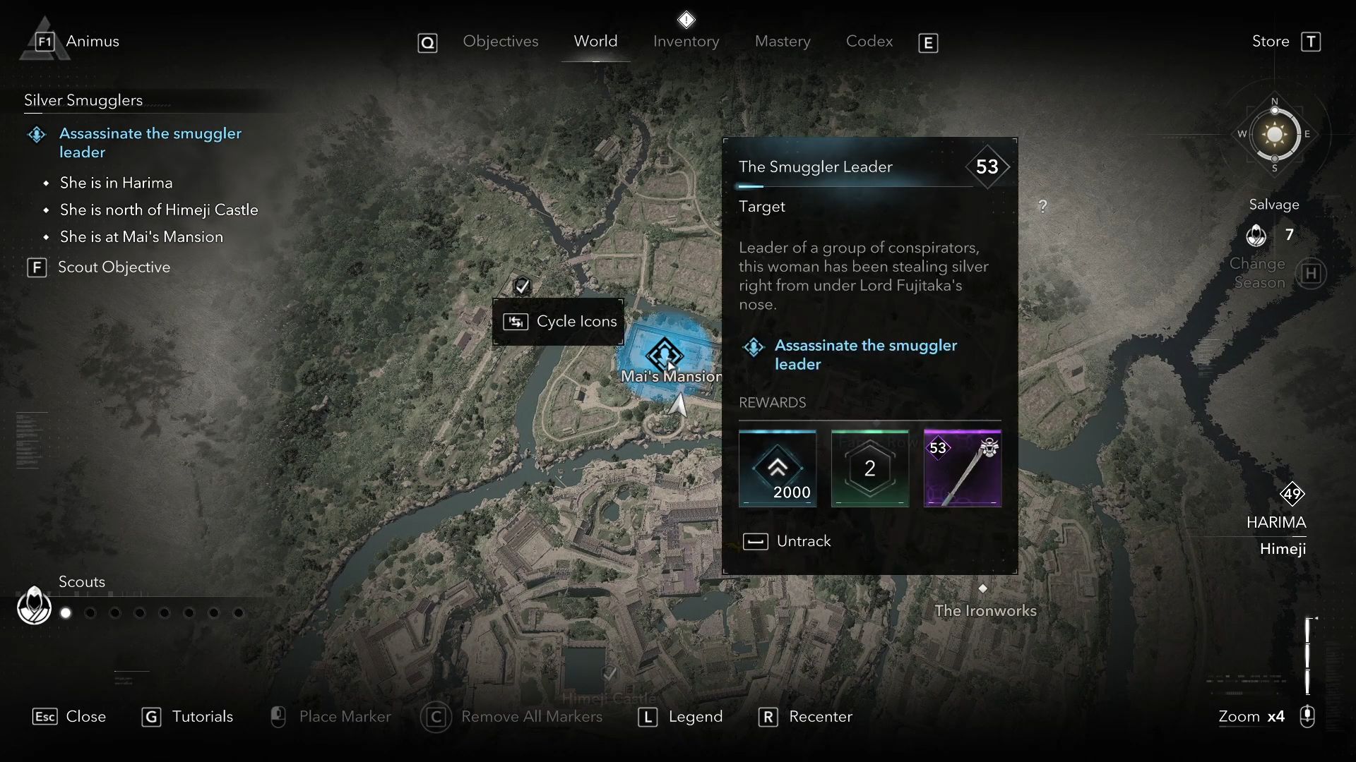 走私頭目將出現在麥的宅邸中。它位於姬路城以北。你只需在目標屏幕中選擇目標,就會出現一個藍色標記並引導你走向她。但是,如果這不起作用,只需將偵察兵部署到我們剛才提到的區域,您應該就能找到該位置。