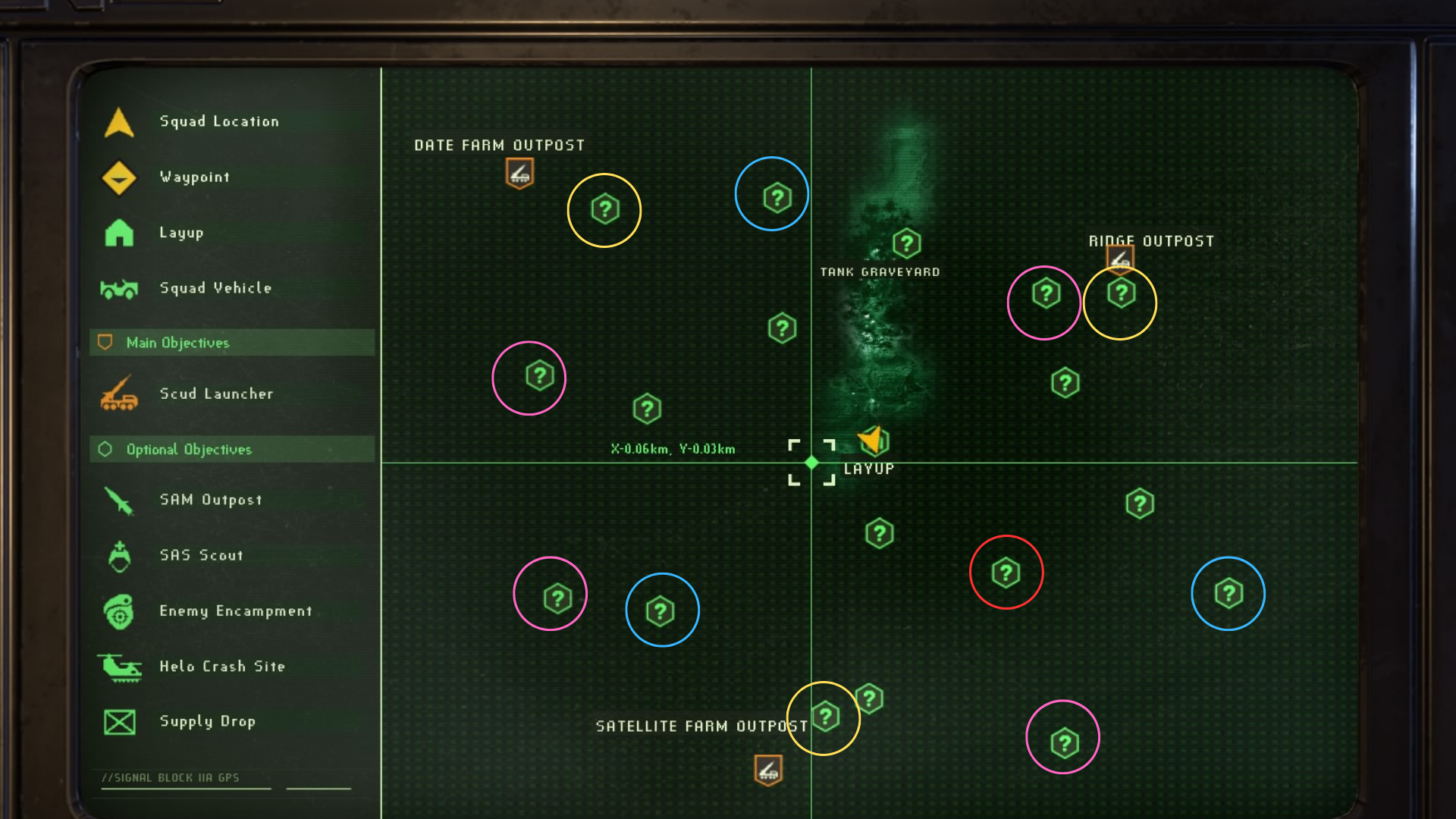 我們建議您在沙漠中慢慢來,並與SAS 偵察兵第一的。我們已將它們標記為黃色的在上圖中。只需與他們互動,他們就會顯示大部分地圖目標,您可以將其與左側的圖例相匹配。