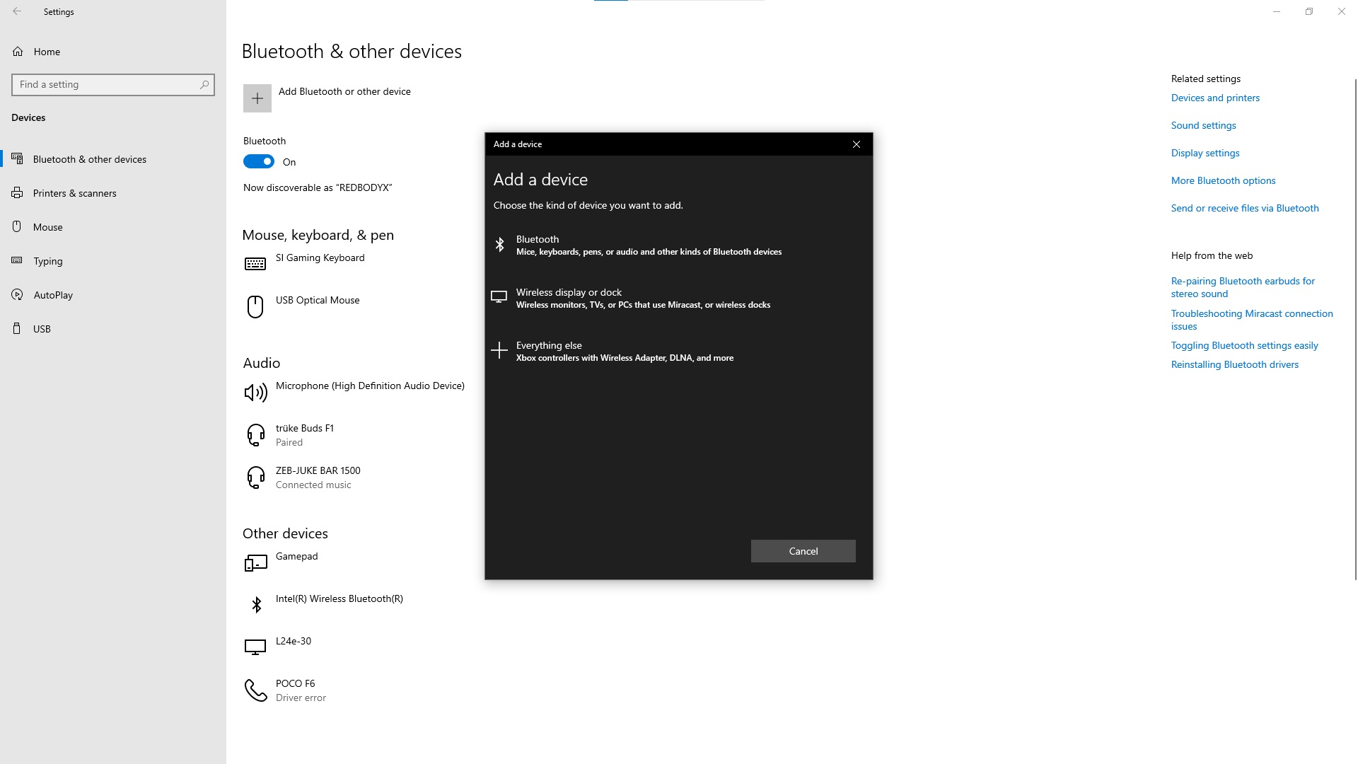 - 接下來,單擊添加設備或者添加藍牙或其他設備按鈕並選擇藍牙。