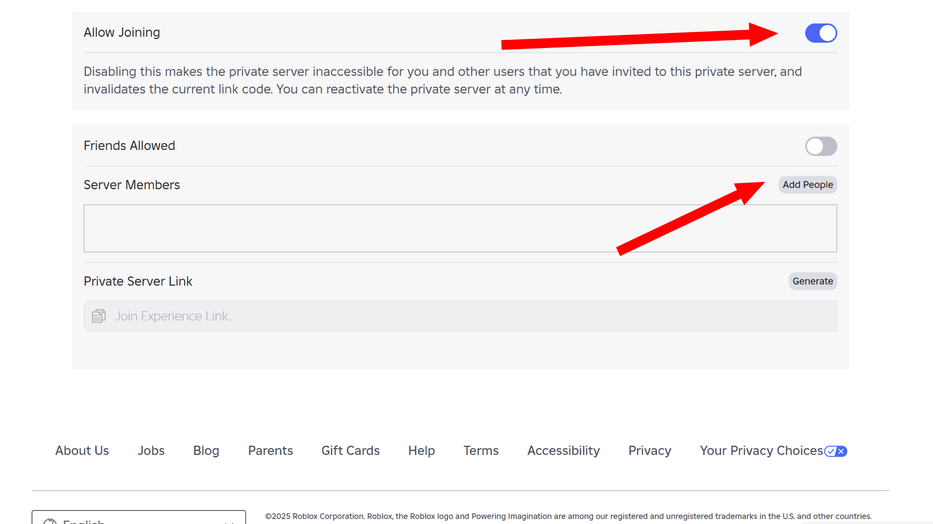 - 如果您希望 Roblox 好友加入,請切換“允許好友' 選項。