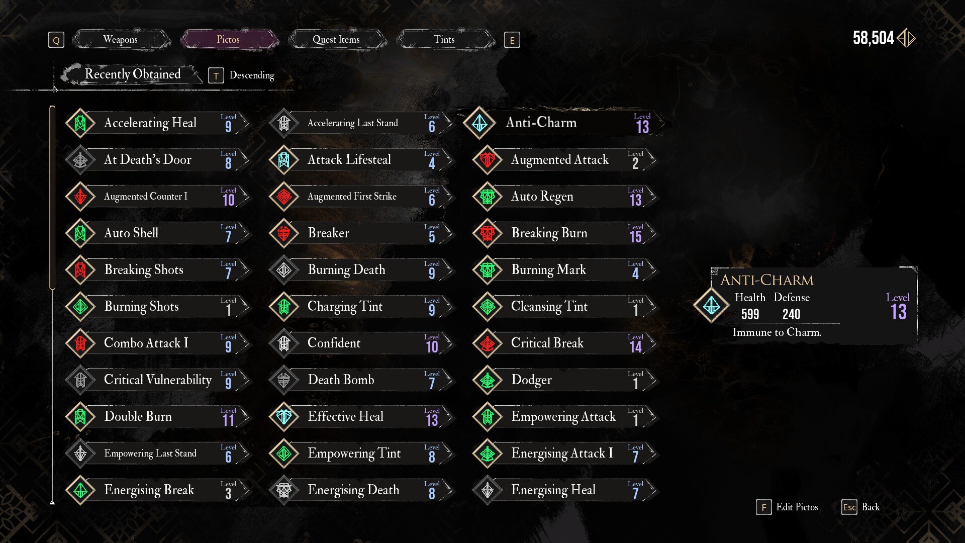 Sirene 最大的優勢是她能夠造成傷害魅力地位。一旦一名隊員受到魅力影響,他們就會在死亡前輪流攻擊另一名隊員。類似於枯萎病, 魅力不能被驅散色調。此外,你無法躲避魅惑,因為它是自動施加的。然而,你可以使用 Pictos/Luminas 來抵消魅惑的效果。您可以使用反魅惑Picto 從本質上抵消了 Sirene 最強大的能力。一旦你獲得了反魅惑圖,一定要把它轉換成發光體。這樣,您就可以為多個隊伍成員裝備反魅惑特質。裝備反咒語可以大大降低戰鬥的難度。