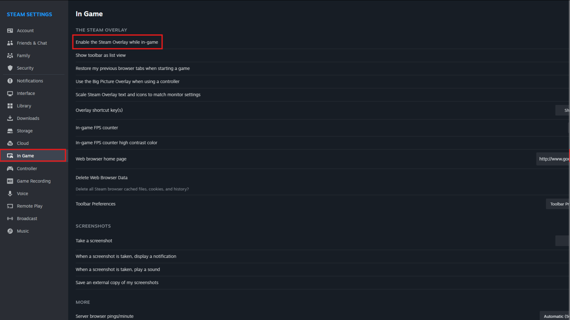 - 關閉“遊戲中啟用 Steam 疊加”選項。