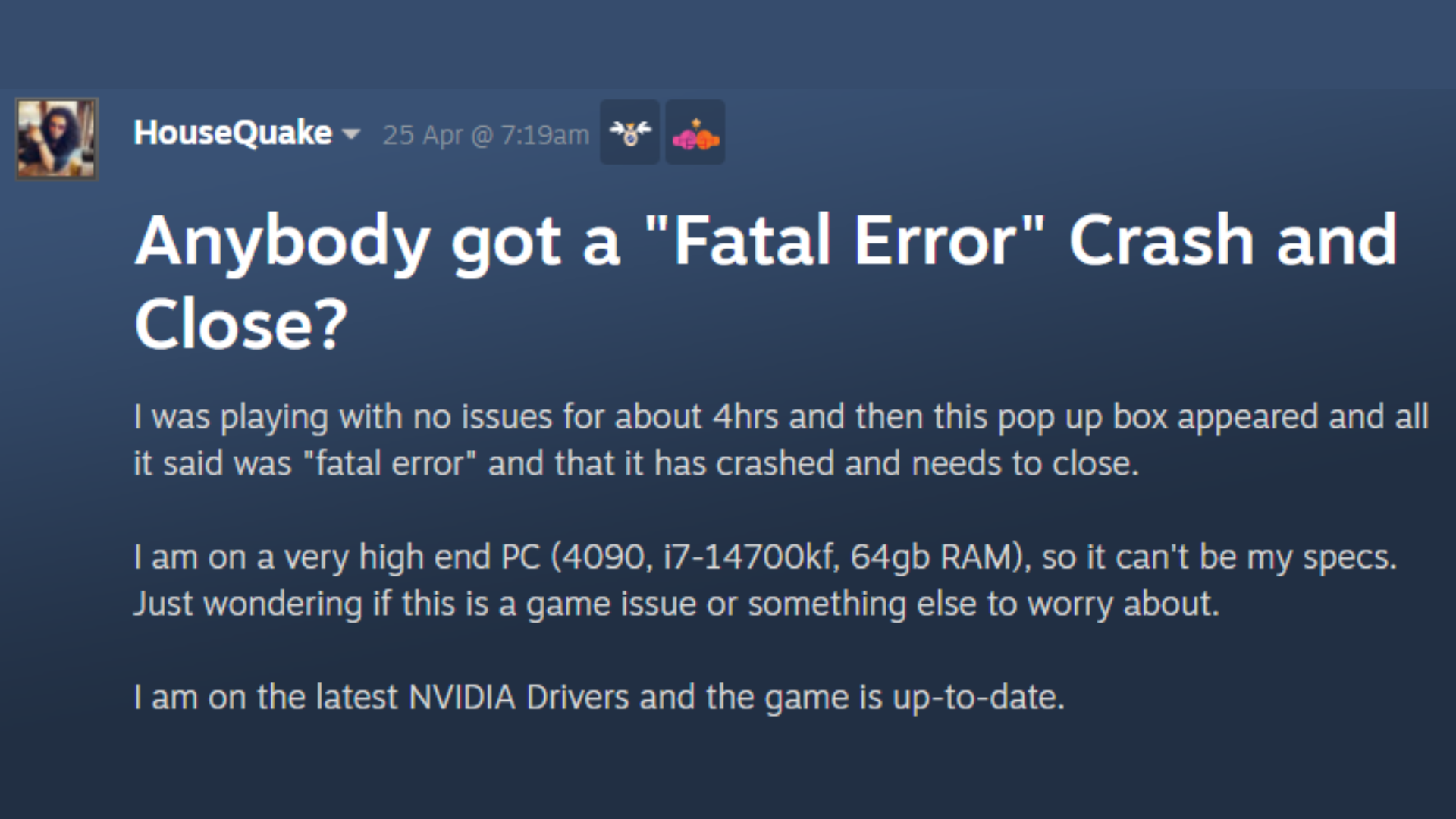 有趣的是,在遊戲發布的早期階段,玩家並沒有遇到這個錯誤。過了一段時間,致命錯誤開始發生,他們的遊戲崩潰了。