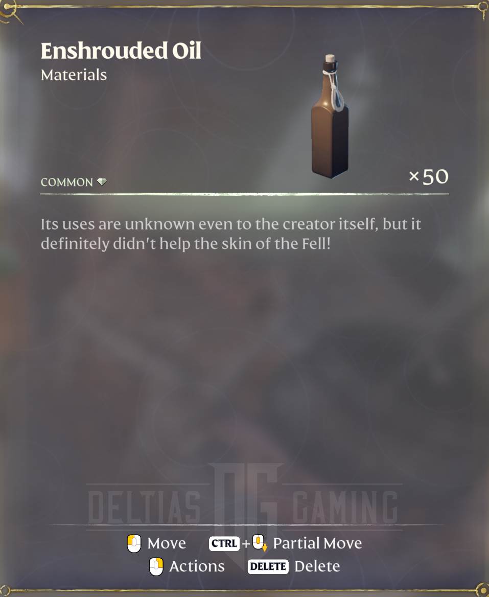 籠罩之油的“用途甚至連創造者自己都不知道,但它絕對對墮落者的皮膚沒有幫助!”它可能看起來像一個無用的資源,但它對於某些後期遊戲項目非常有用。它可以讓您生產出最大變體的魔法箱,與較小的對應物相比,這些魔法箱可以提供額外的存儲空間。此外,通過使用油製作寶箱魔法,您可以直接從供應商和站點訪問其內容,而無需直接在庫存中使用資源。