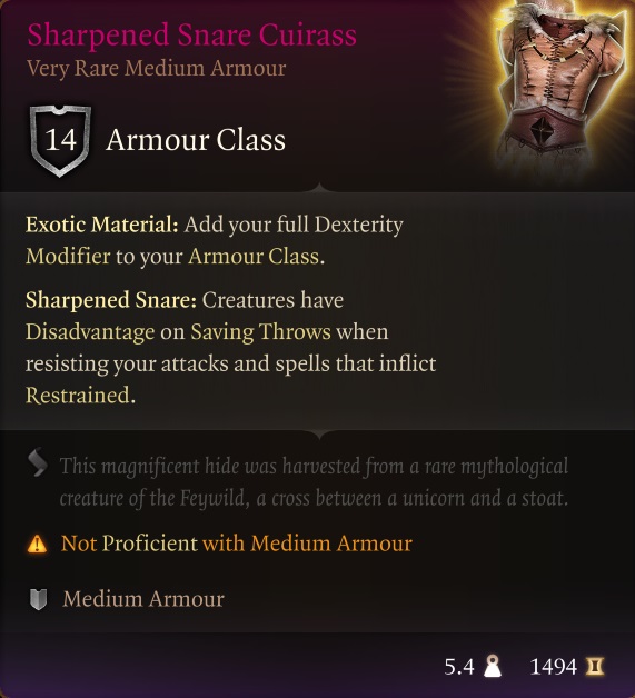 - 奇異材料:將完整的敏捷調整值添加到你的護甲等級中。此外,這套盔甲不會對隱形能力檢查造成不利影響。