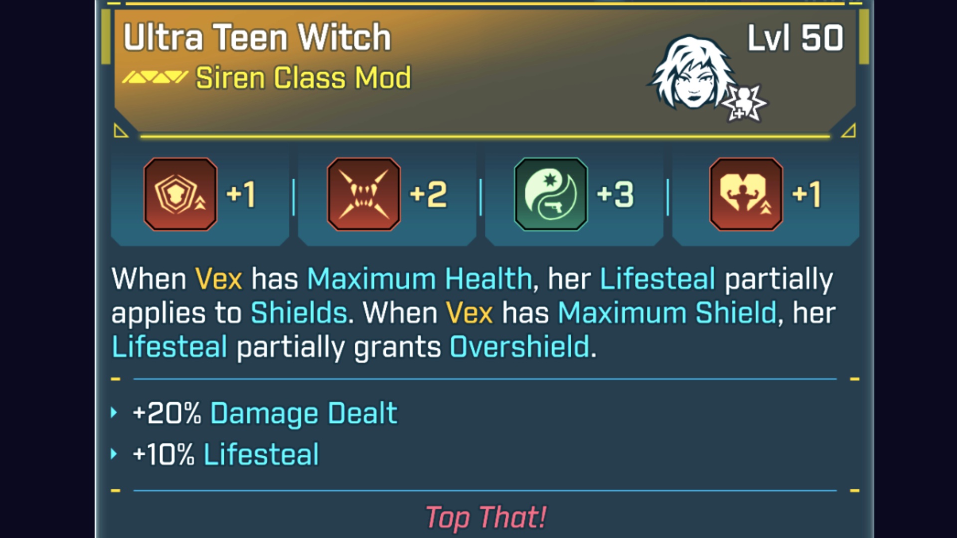 如前所述,青少年女巫傳奇級模組適用於 Vex。它有一個名為“Top That!”的獨特福利,如下: